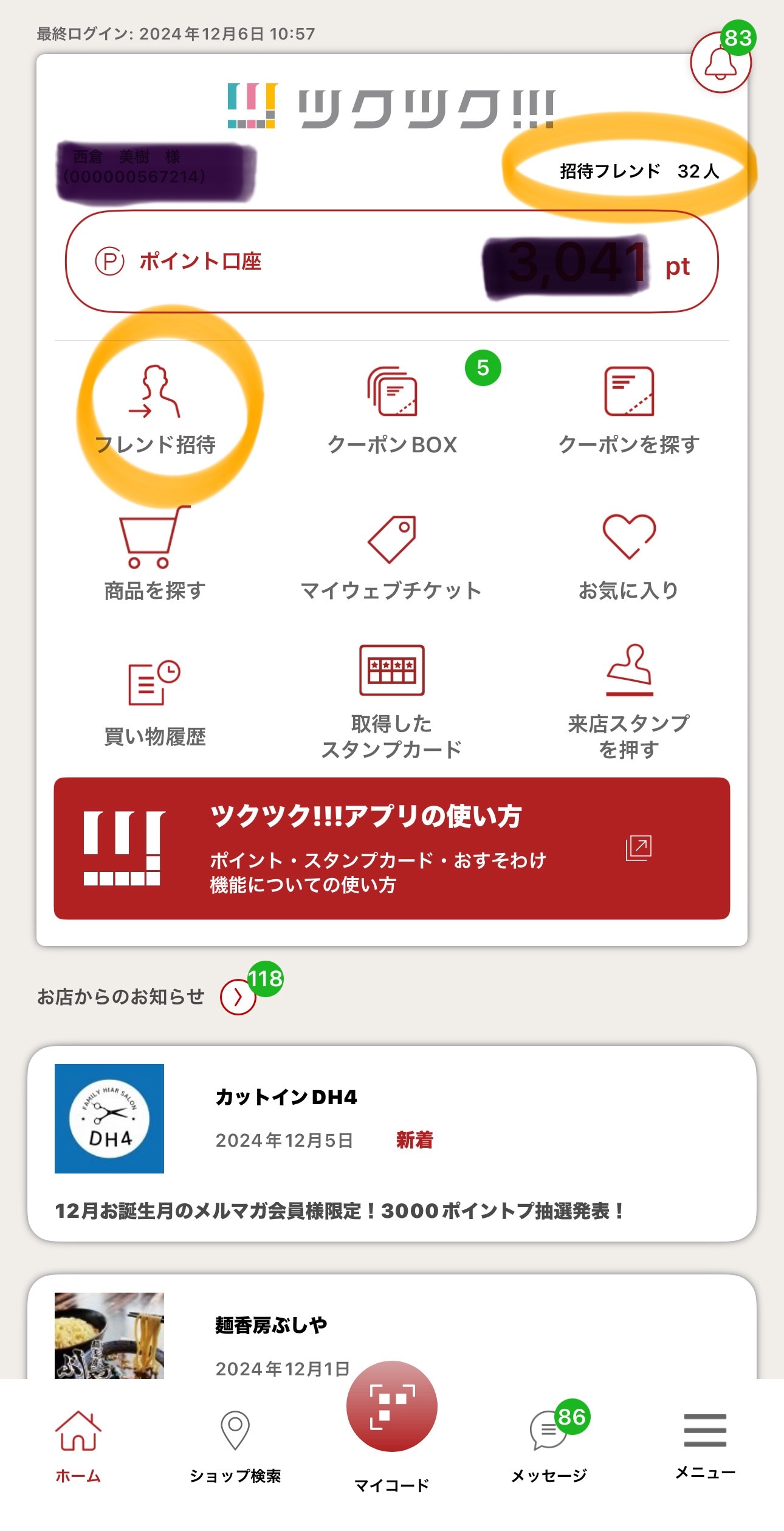 ※トップページの右上にある、ポイント口座が100ポイント増えてたら登録出来てるサインです♪招待フレンドの人数も増えてるはず♬