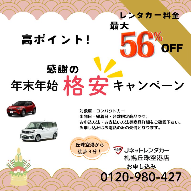 今年、初の試みで「レンタカー料金最大56%OFF 年末年始 🌟感謝の格安キャンペーン!」を実施させていただきます。