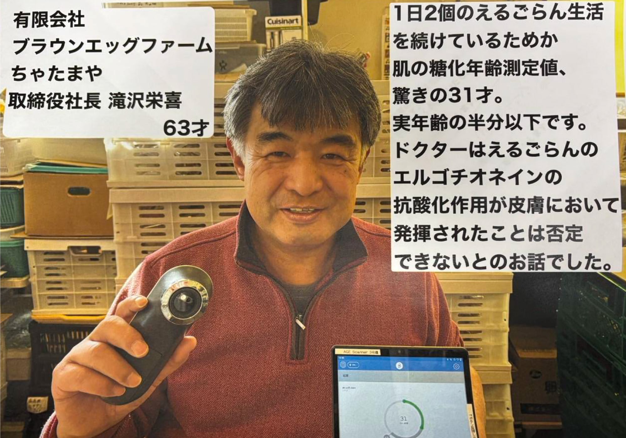 本人は還暦を過ぎてはおりますが、確かに肌ツヤは良いなぁとは感じていました。とあるお医者様のツテで肌の糖化年齢測定器で測ったところ、31歳という数値が出たそうです!!