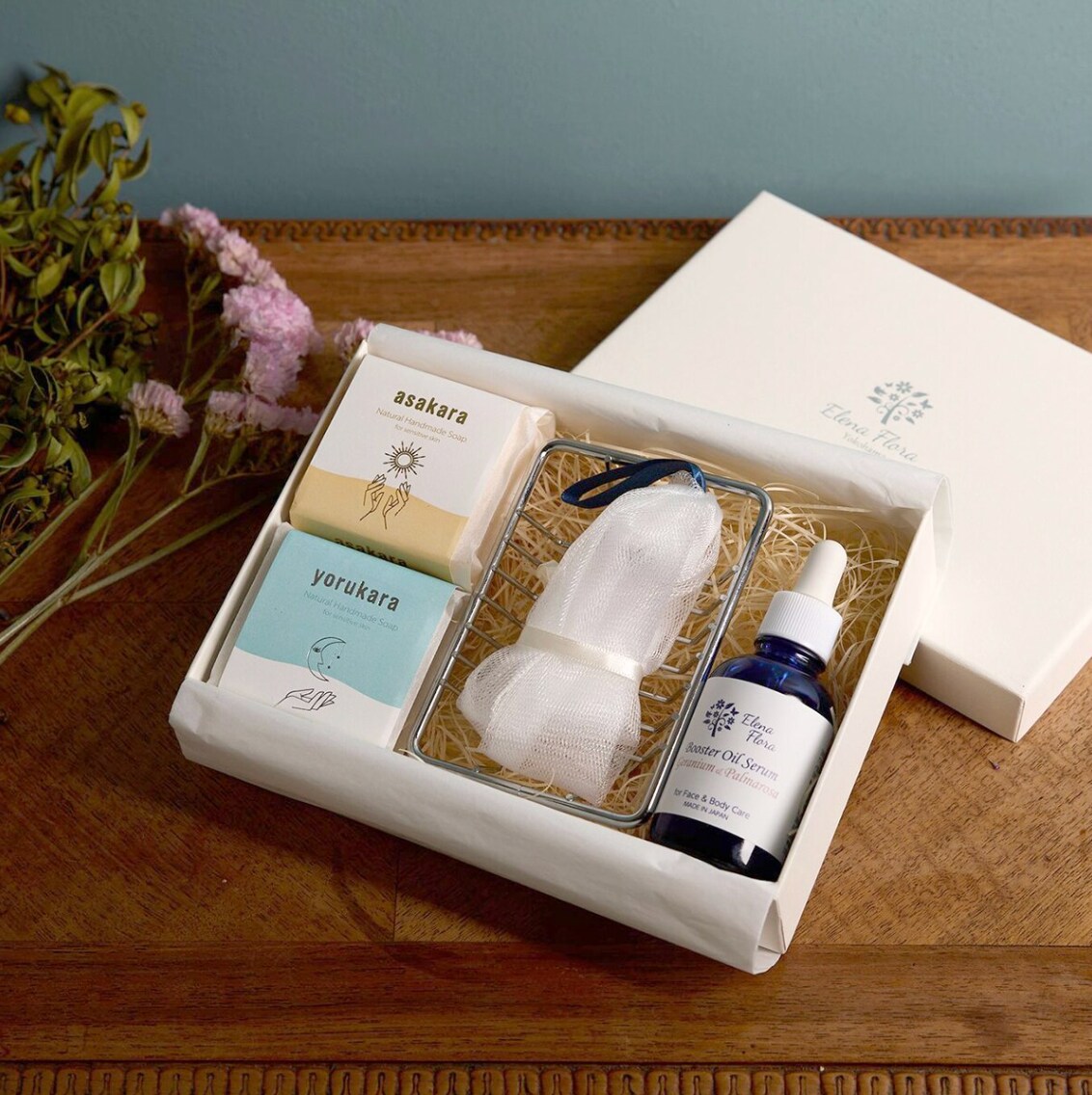 美容オイル フランキンセンス(50ml)に泡立てネットをサービスとしてお付けし、エレナフローラの箔入りギフトボックスにリボンをつけた、美容にご興味のあり方に喜ばれるギフトボックスです。(商品ページからの引用)