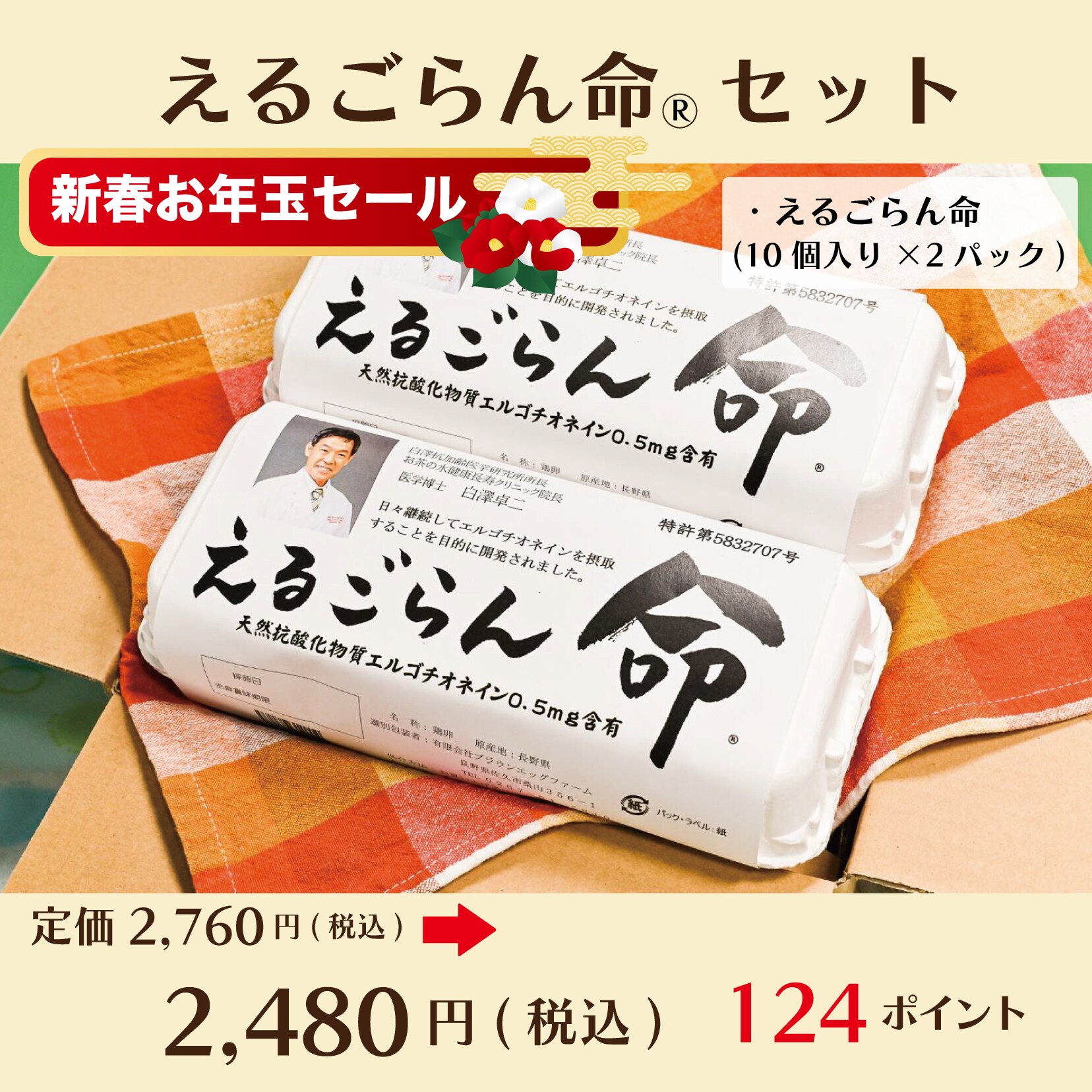 高ポイント!!【高級たまご】えるごらん命セット20個(10個入り×2パック)〜ちゃたまやイチオシ!!抗酸化成分「エルゴチオネイン」配合卵〜