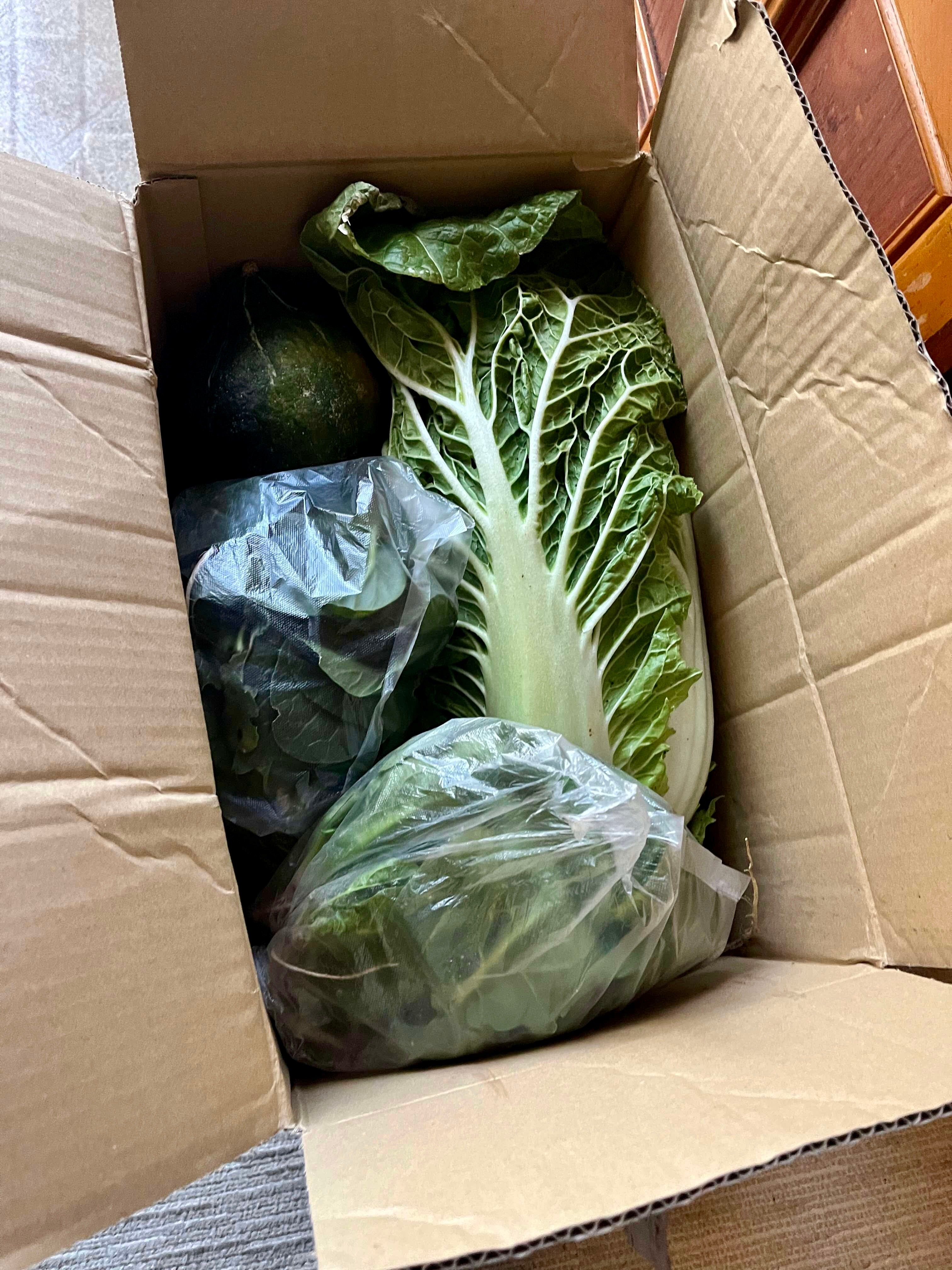 2024年最後のお野菜支援で、白菜、里芋、じゃがいも、さつまいも、生姜、大根、人参、ほうれん草、小松菜、キンカンをいただきました。