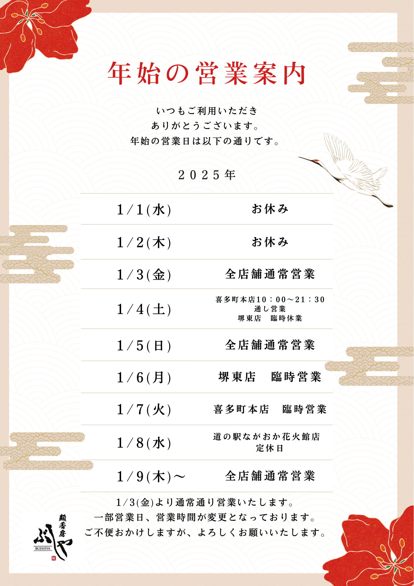 【麺香房ぶしや】年始の営業についてのお知らせです📢
