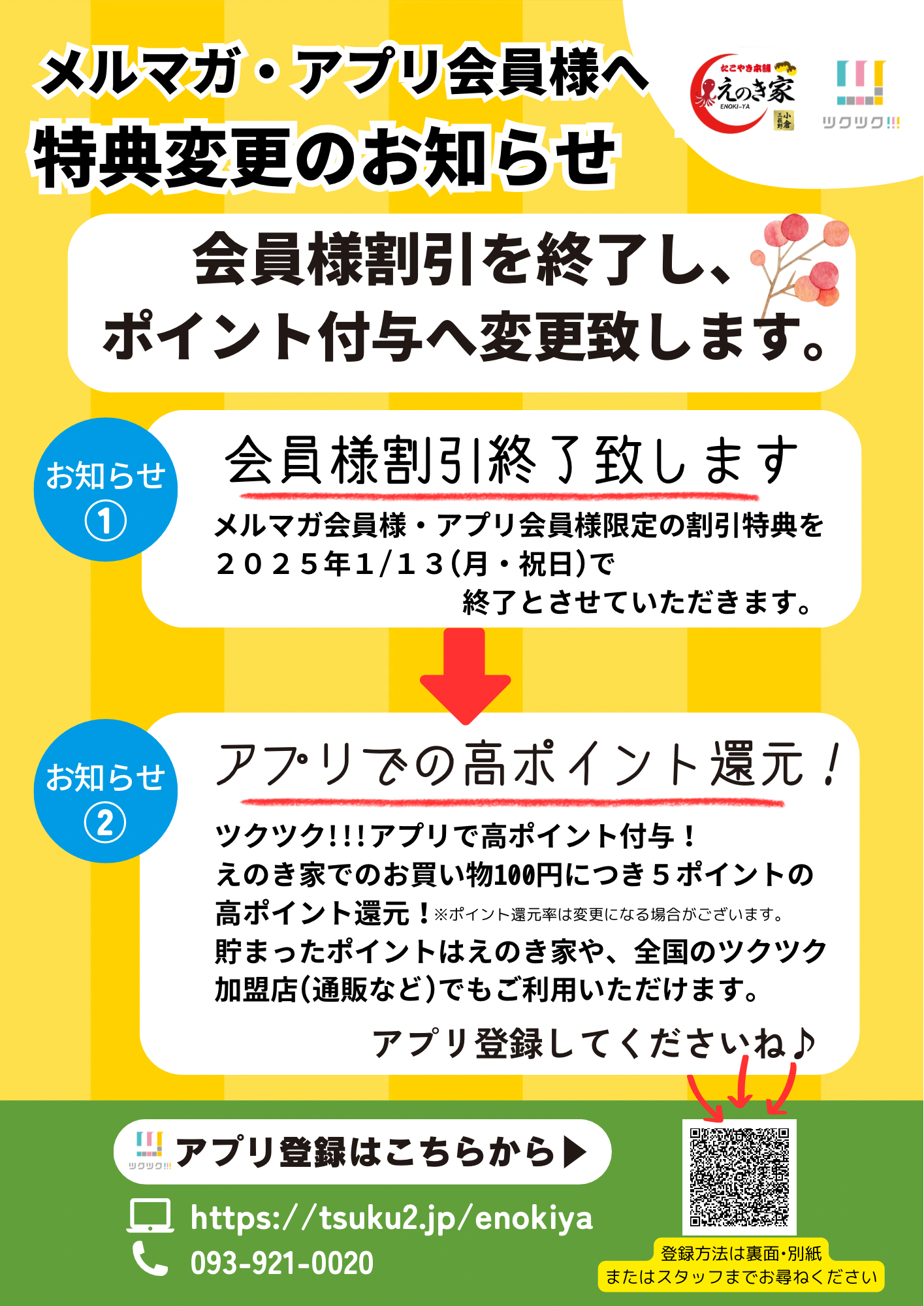 現在、メルマガ会員様・アプリ会員様には「たこ焼き・えび焼き・焼きそばなど、通常1パック500円〜を、会員様限定で1パック400円、2パック800円、3パック1,100円にてご提供」しておりましたが、こちらの割引き特典を2025年1月13日(月)にて終了とさせていただきます🙇🏻♂️🙇🏻♀️