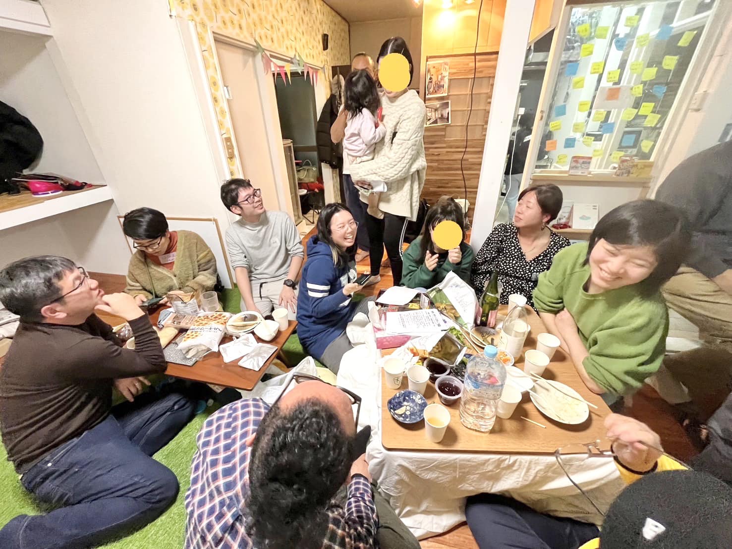 *写真は登戸ハウスのコミュニティスペースで開催した"すっかり親せき日本酒会"で、さんざん遊んでもらった2歳児とママが「寝るね〜」と隣の部屋に帰るシーンです。