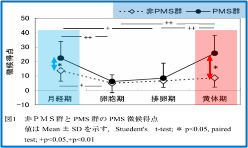 PMS徴候得点を見ると月経期と黄体期を比べると