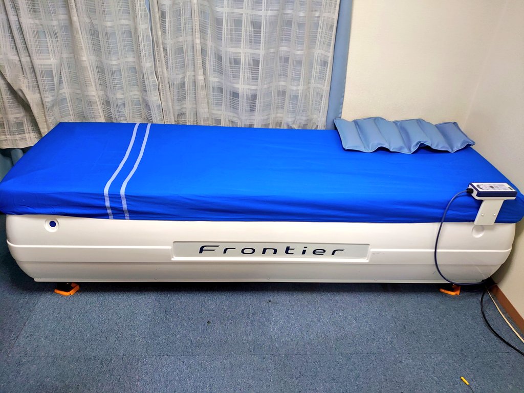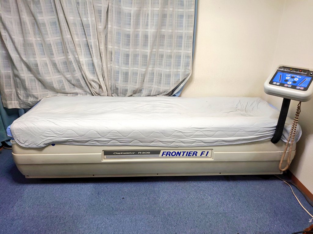 28年間使用したローラーベッドが使用不能になり新しいローラーベッド(青いカバー)が搬入されました。コントロールパネルが無くなり、有線のリモコンに変化しました。