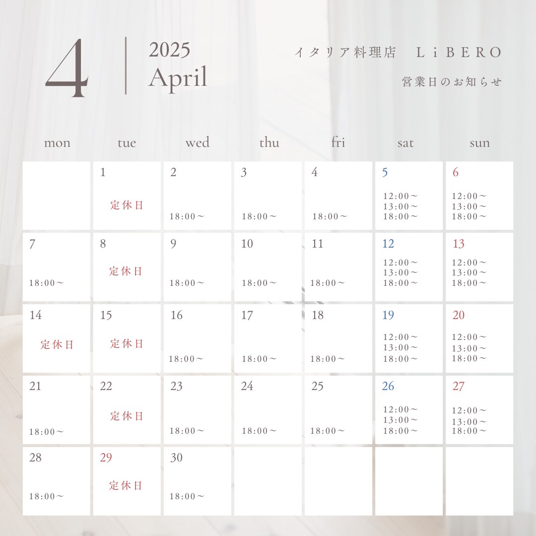 ※4月29日は祝日ですが火曜日の為定休日です。