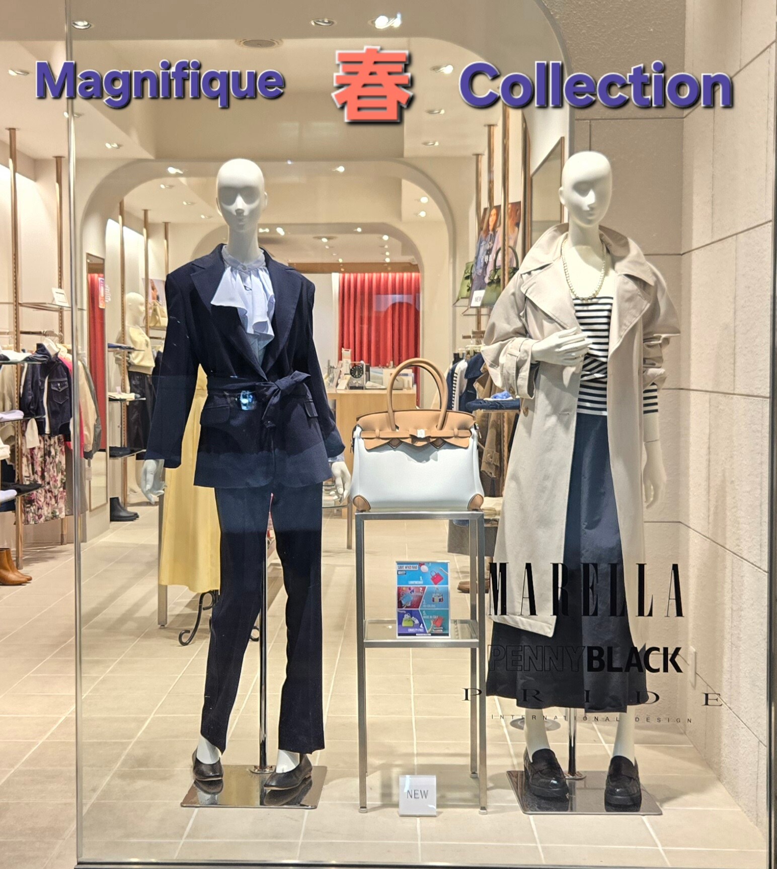 メインのディスプレーはキレイ目コーデで✨マレーラのローブジャケット&パンツのセットアップに少し甘さをプラスしてフリルブラウスをチョイス。式典にも着て頂けます。