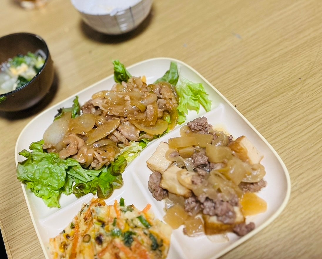 生姜焼き、野菜スープ、そしてご飯も炊いて。