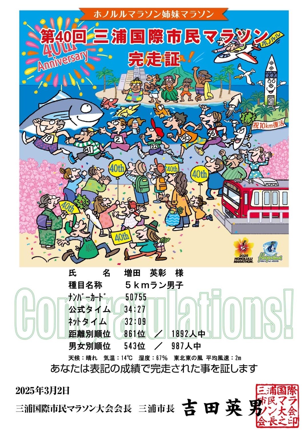 3月2日の日曜日の第40回三浦国際市民マラソンの5kmラン男子に参加して、無事に完走できました。