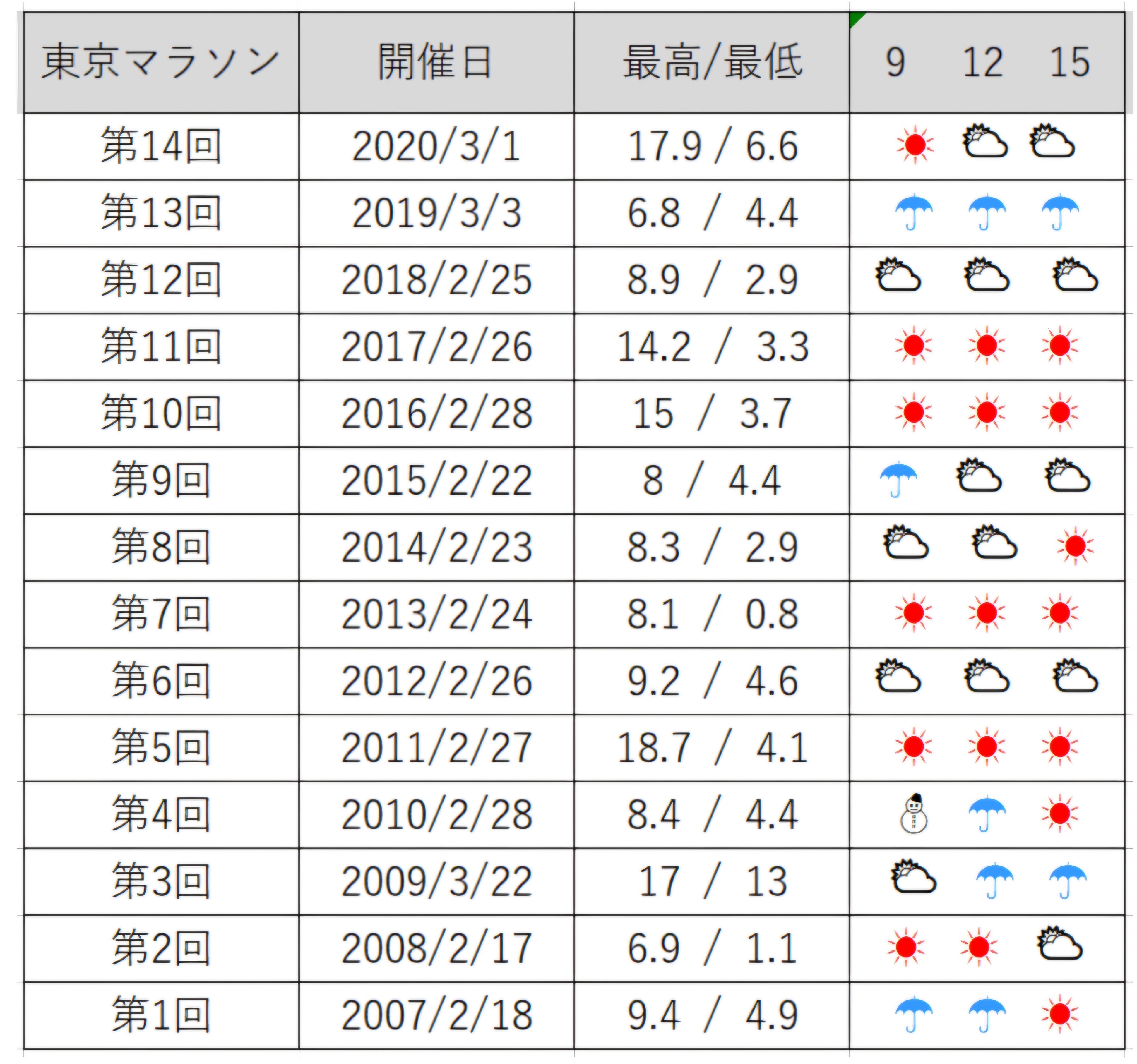 マラソン当日に雪や雨降らなくて