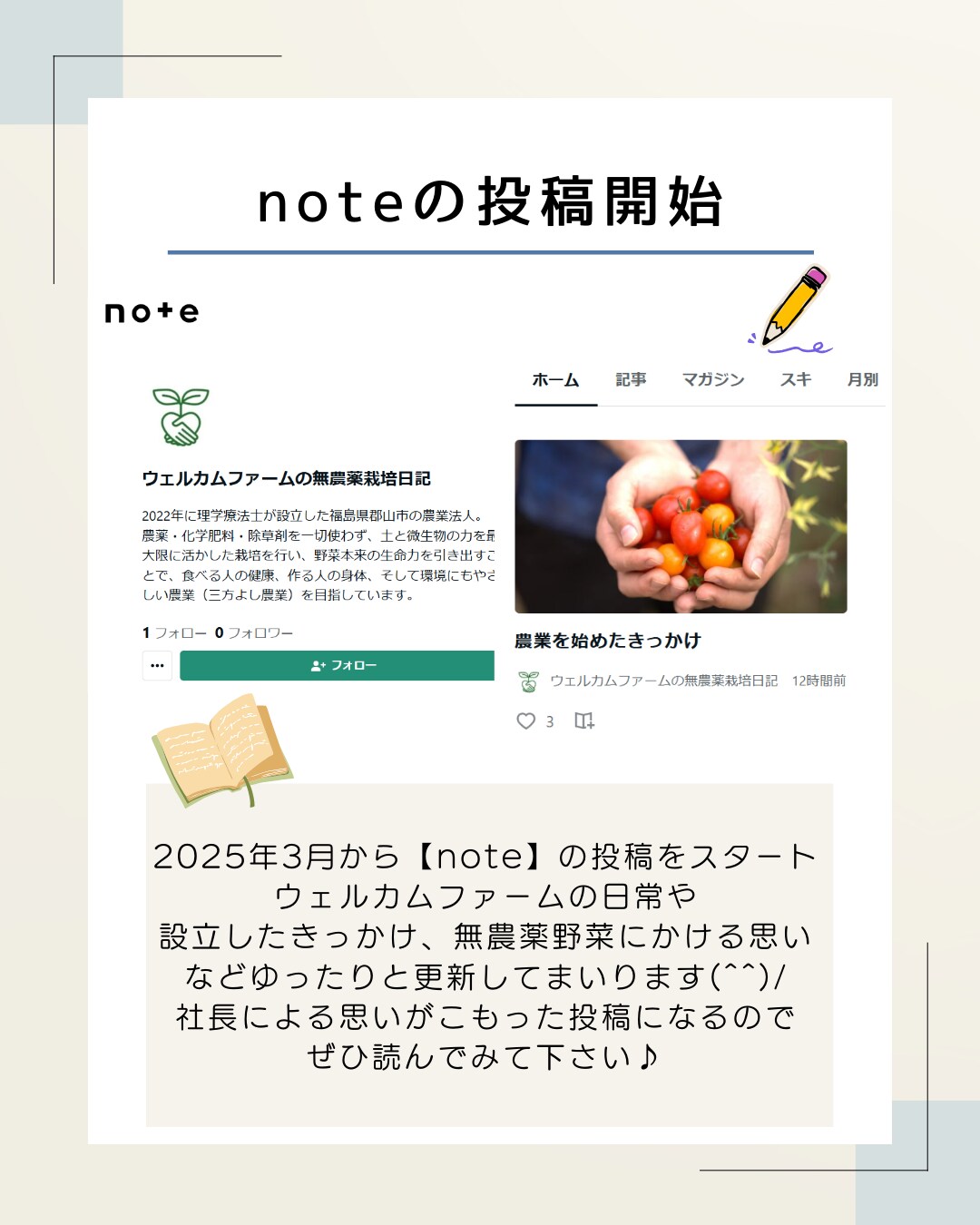 また【note】の投稿も開始されました!高田代表による「ウェルカムファームの無農薬日記」ではウェルカムファームの日常や無農薬野菜にかける思いなど、健康や環境について考える代表の思いがこもった投稿を読むことが出来ます📖