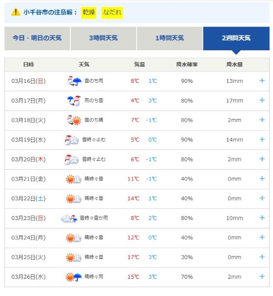 春の彼岸で花粉情報も飛び交う中で、小千谷には雪が降るようです。