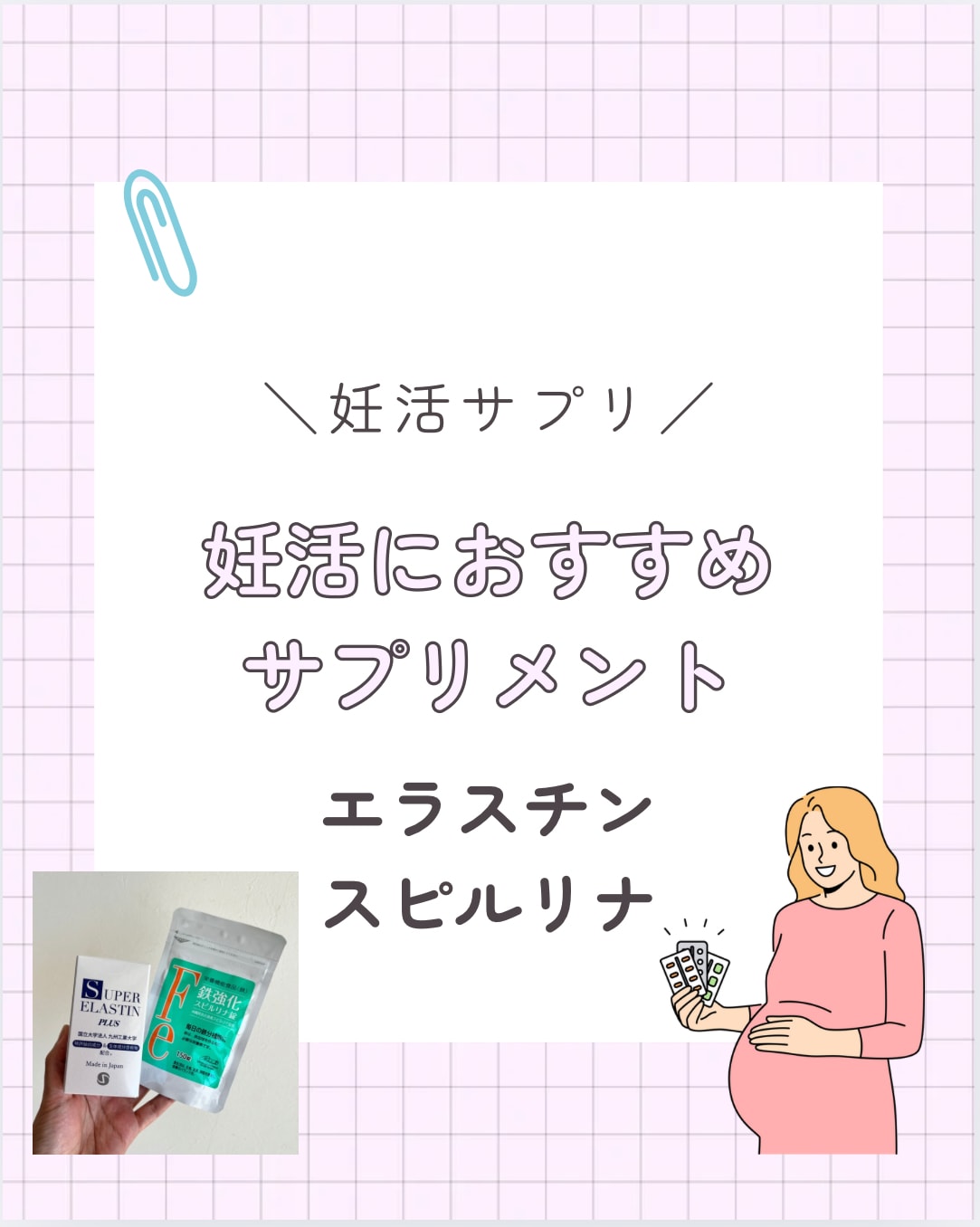 鉄分、葉酸、ビタミン、タンパク質が入ったサプリ。尿に流れにくく身体に吸収しやすいのとスピルリナ自体が藻になるため身体に負担がなく便秘になりにくい。妊婦中、授乳中も飲んで大丈夫です。