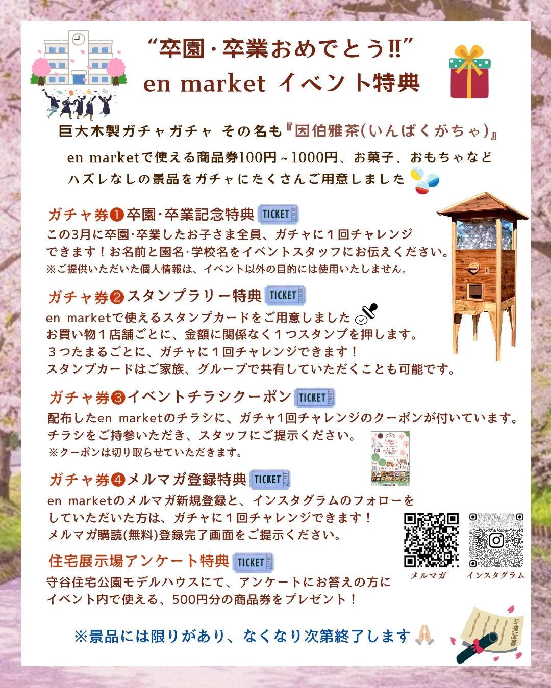 卒園・卒業したお子様への特典や、大好評の巨大ガチャガチャ・スタンプラリーもご用意しております🎁