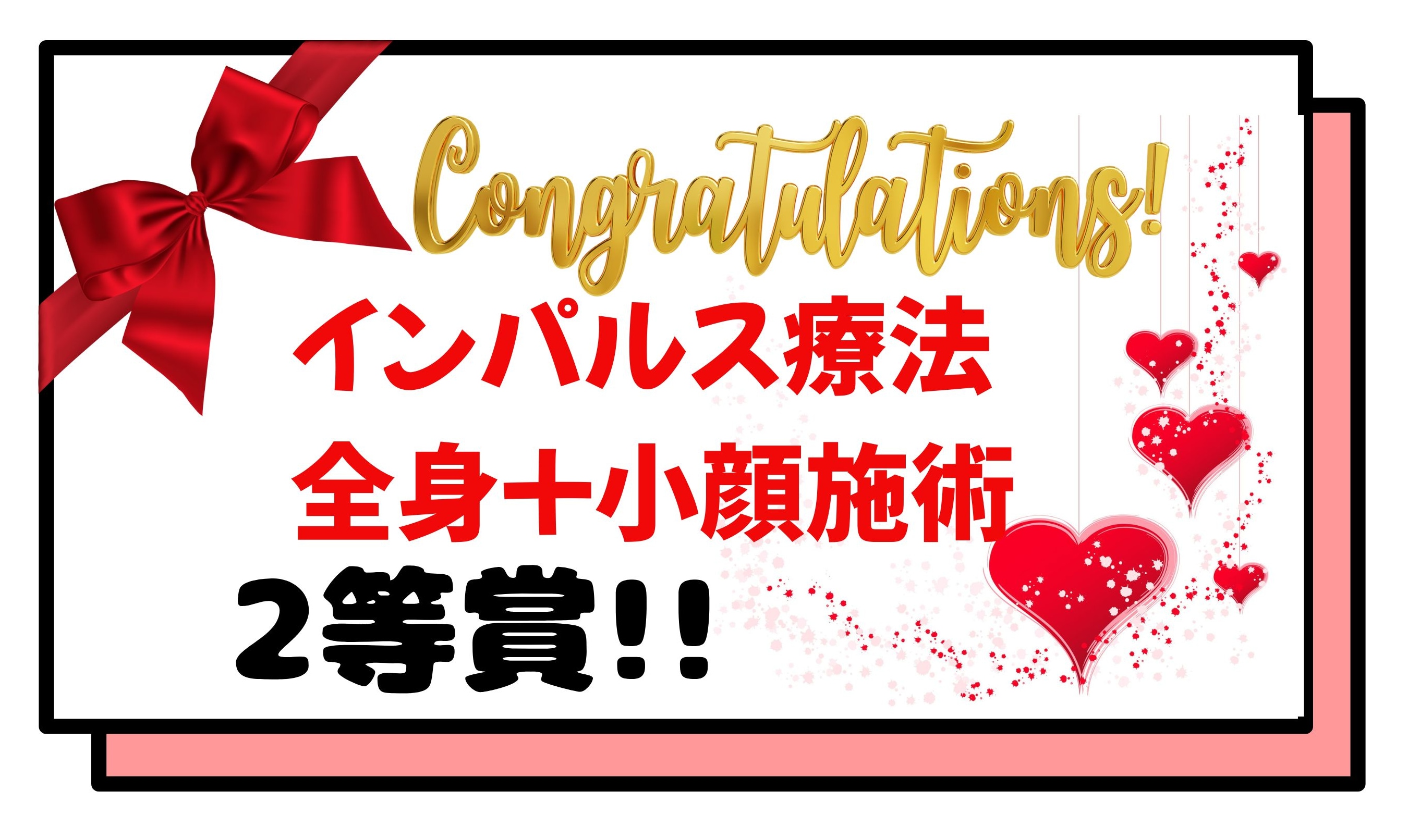 2等ご当選の4名の方にインパルス療法(ボディ+フェイス)施術(10000円相当)もしくは、ぽっこりお腹を凹ませくびれができる呼吸法(オンラインレッスン5000円相当)を、ご家族皆様やお友達何名でも同席OKのどちらか一つをプレゼントさせていただきます。
