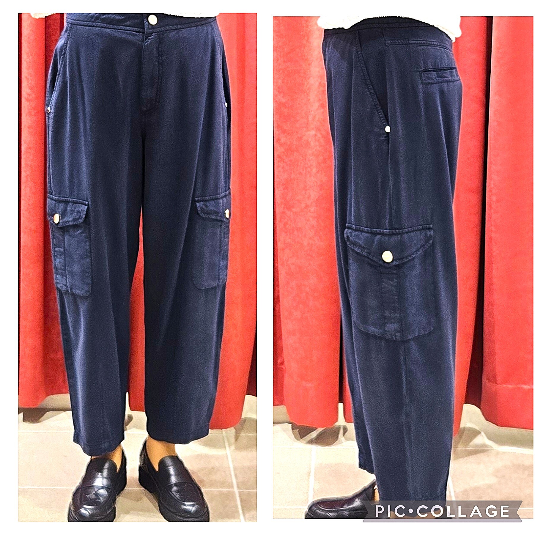 ◆ ネイビーカーゴバレル風パンツ。 脇のポケットがアクセントに。 パンツのデザイン性を活かして、トップスはシンプルに💕