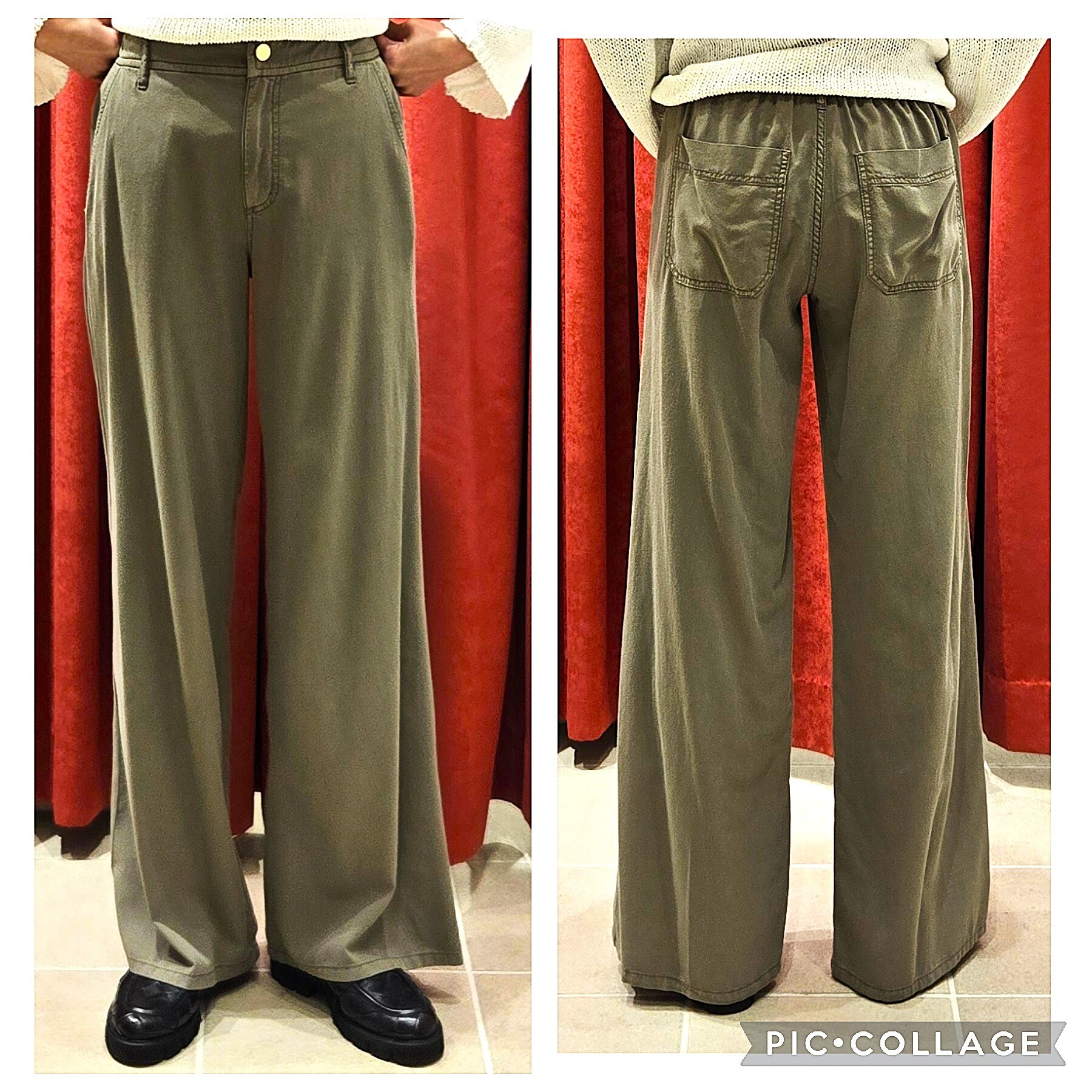 ◆カーキワイドストレートパンツ。 脚長交換抜群のライン。 後ろウエスト部分がゴムなので、収まりも良くキレイ楽チンに履けちゃうパンツです😂