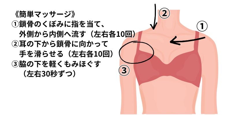 ①鎖骨のくぼみに指を当て、外側から内側へ流す(左右各10回)