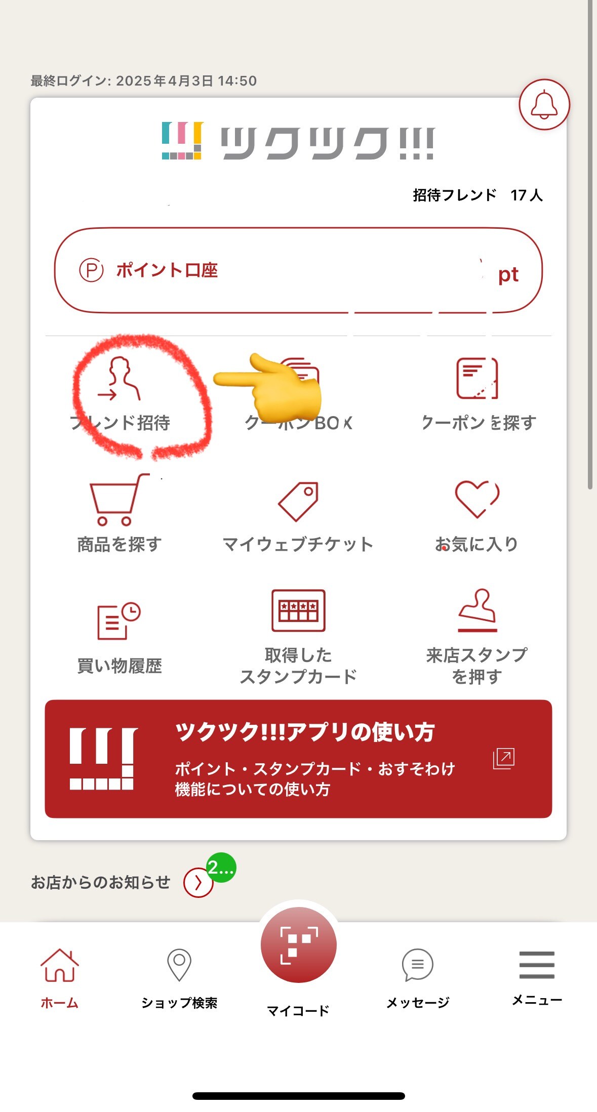 ④お友達が登録すると100ptGet