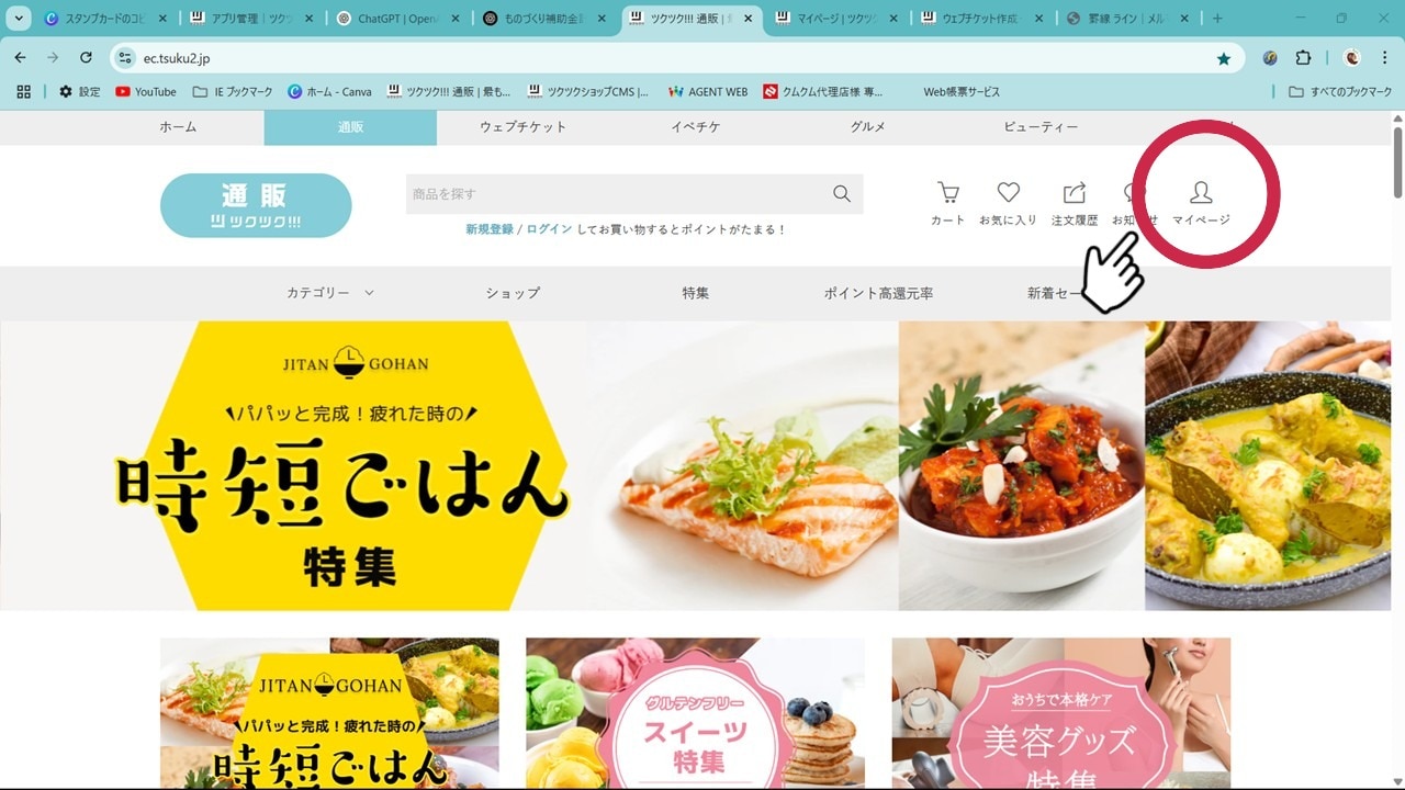 ①ツクツクページ右上マイページを開く