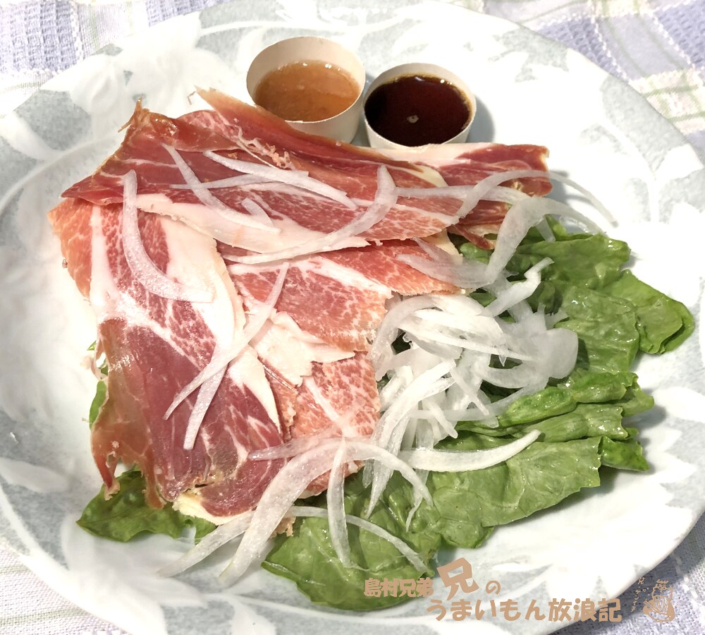 せっかくなので、ウチで販売している玉ねぎとレタスと黒酢玉ねぎドレッシングと更に黒酢玉ねぎポン酢を添えて……
