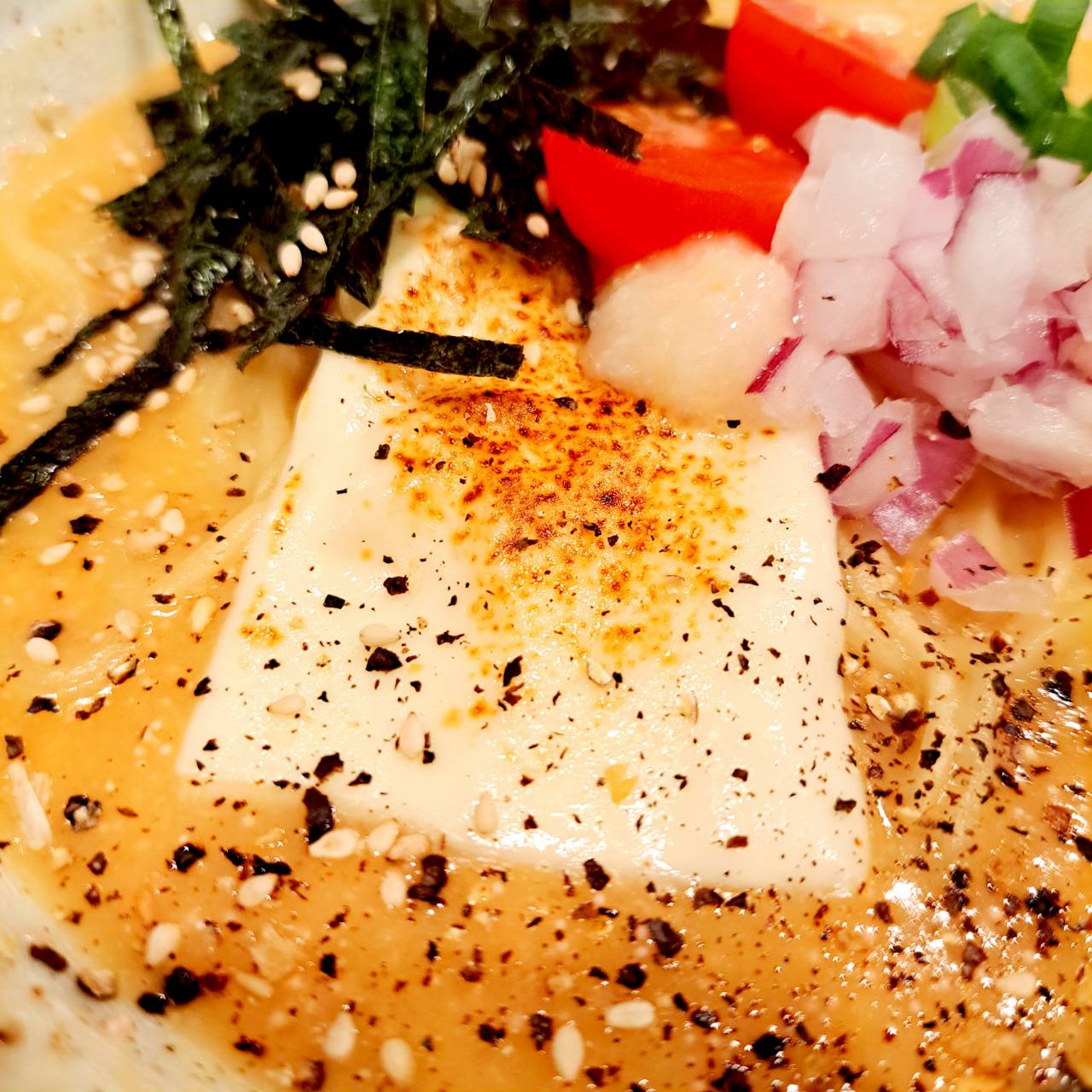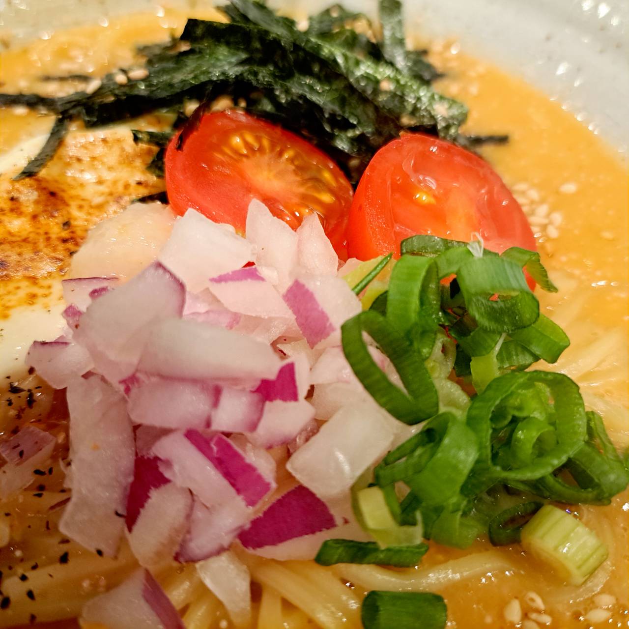刻み玉ねぎ、刻み長ネギ、レモン香るミニトマト、刻み海苔、ツルッとした細麺のバランスが良く美味しいです✨