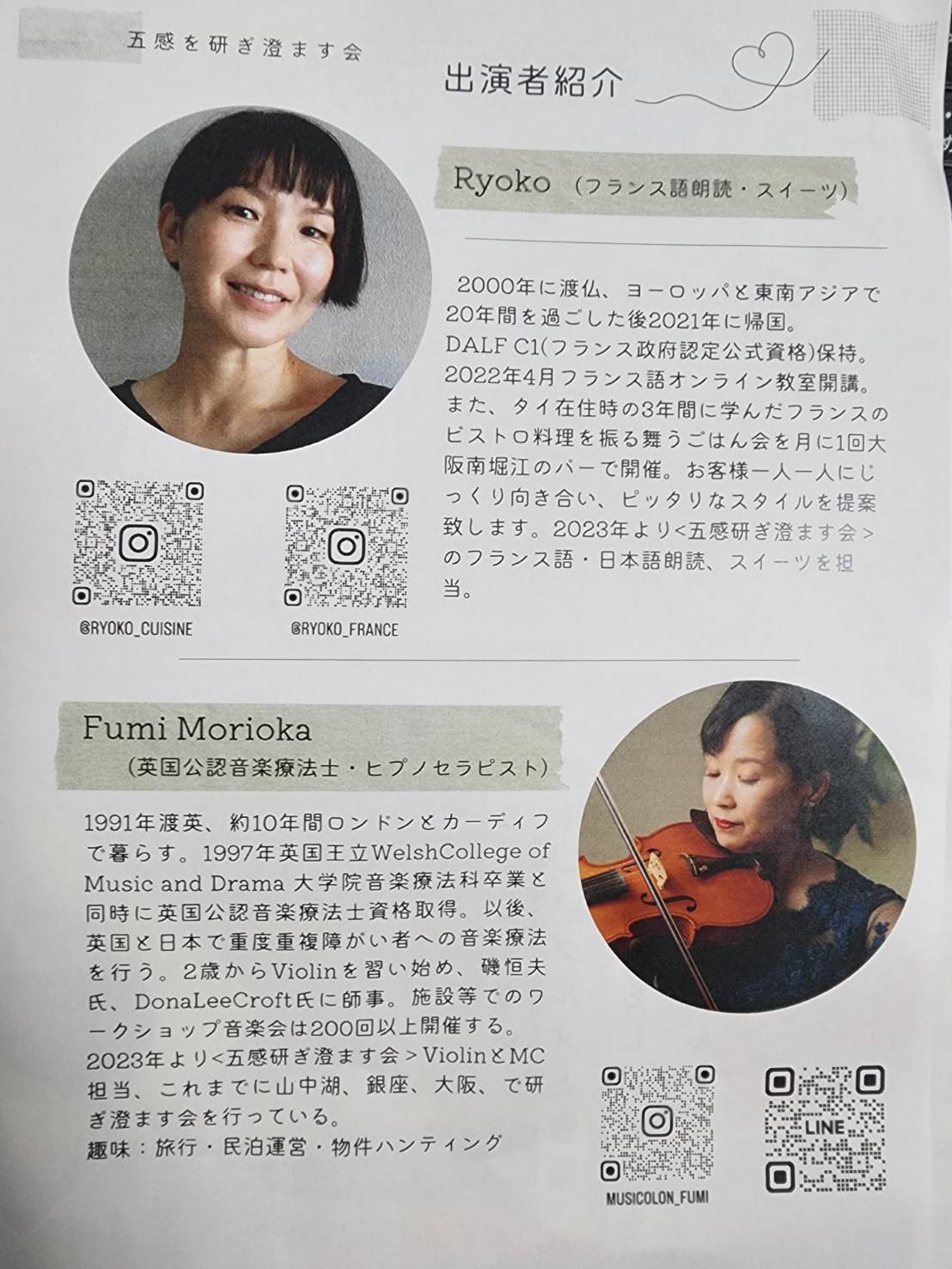 「五感を研ぎ澄ます会 Violinと朗読」