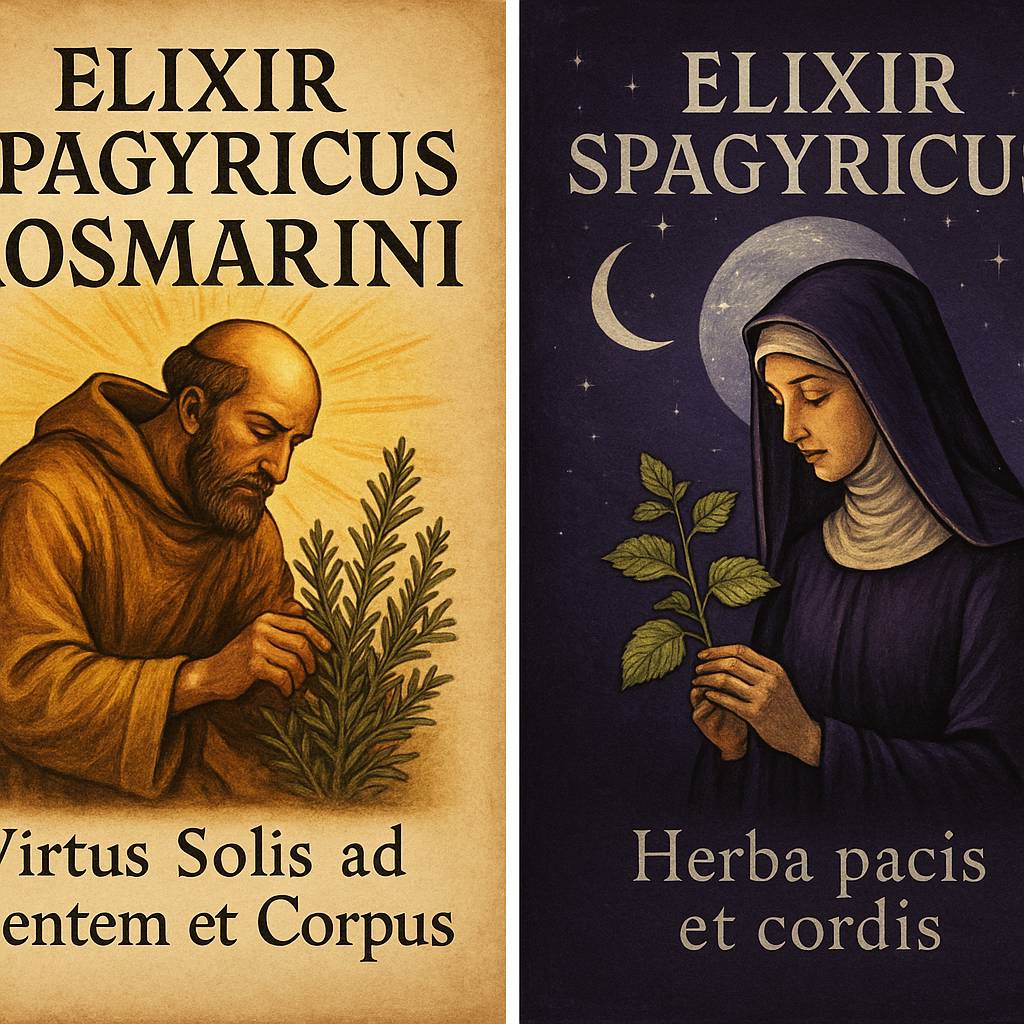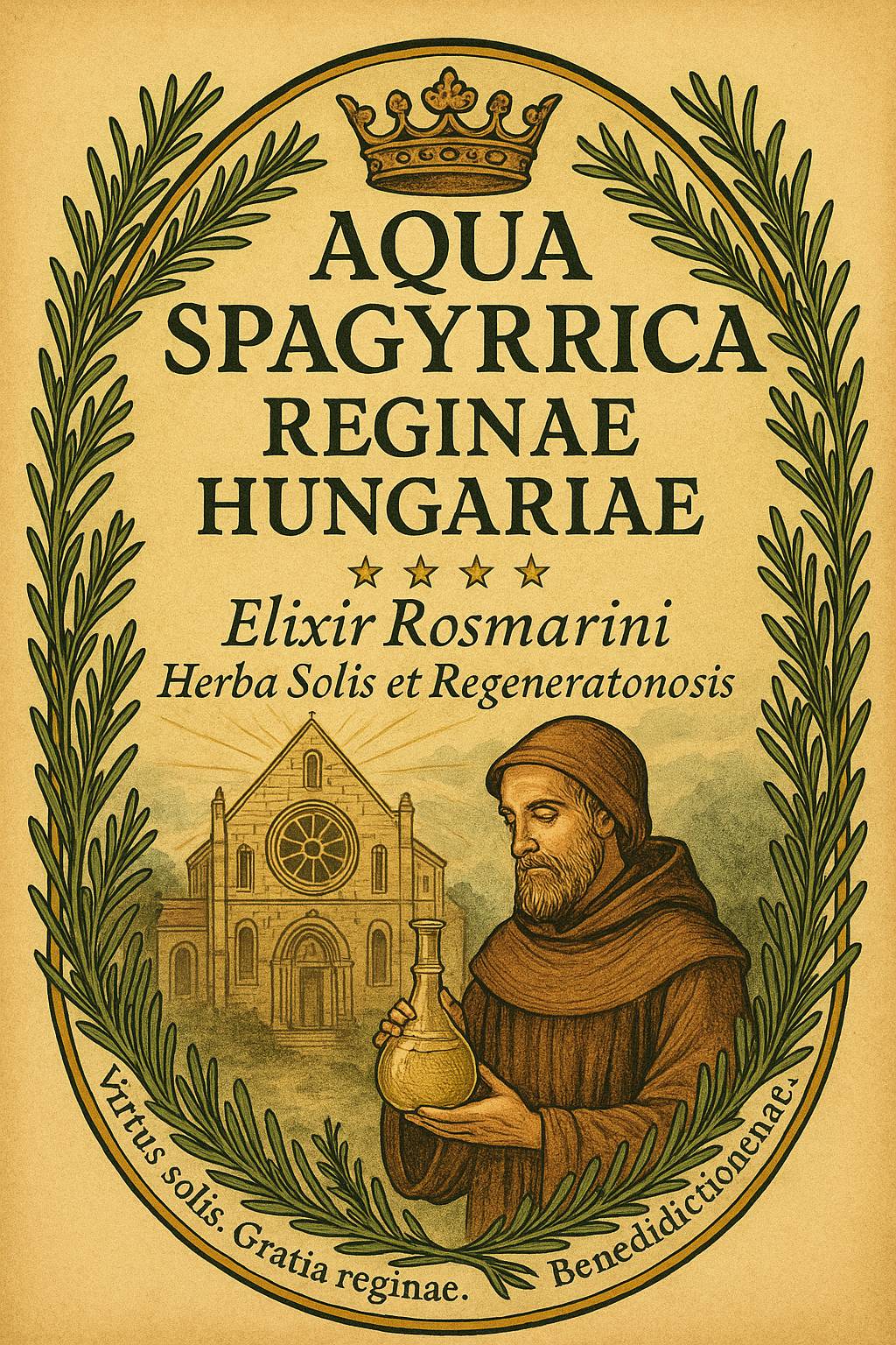 ハンガリーウォーターは、14世紀後半に誕生したといわれており、伝説では、ハンガリー王妃が70歳前後でこの水を使い若返り、隣国ポーランドの若き王から求婚されたという逸話が残っているので有名です。主成分のハーブはローズマリー、ラベンダー、タイム(ミント)などと言われています。ハンガリーウォーターもワインや蒸留酒にハーブを漬け込んで蒸留(蒸留香水の祖)して製造されました。特にカルメル会やベネディクト会系の修道院では、神経系・循環系のケアとして調合され、薬用酒として活用されたそうです。。。。ということで、AI制作のローズマリー(ハンガリー水)のイメージも作ってもらいました!