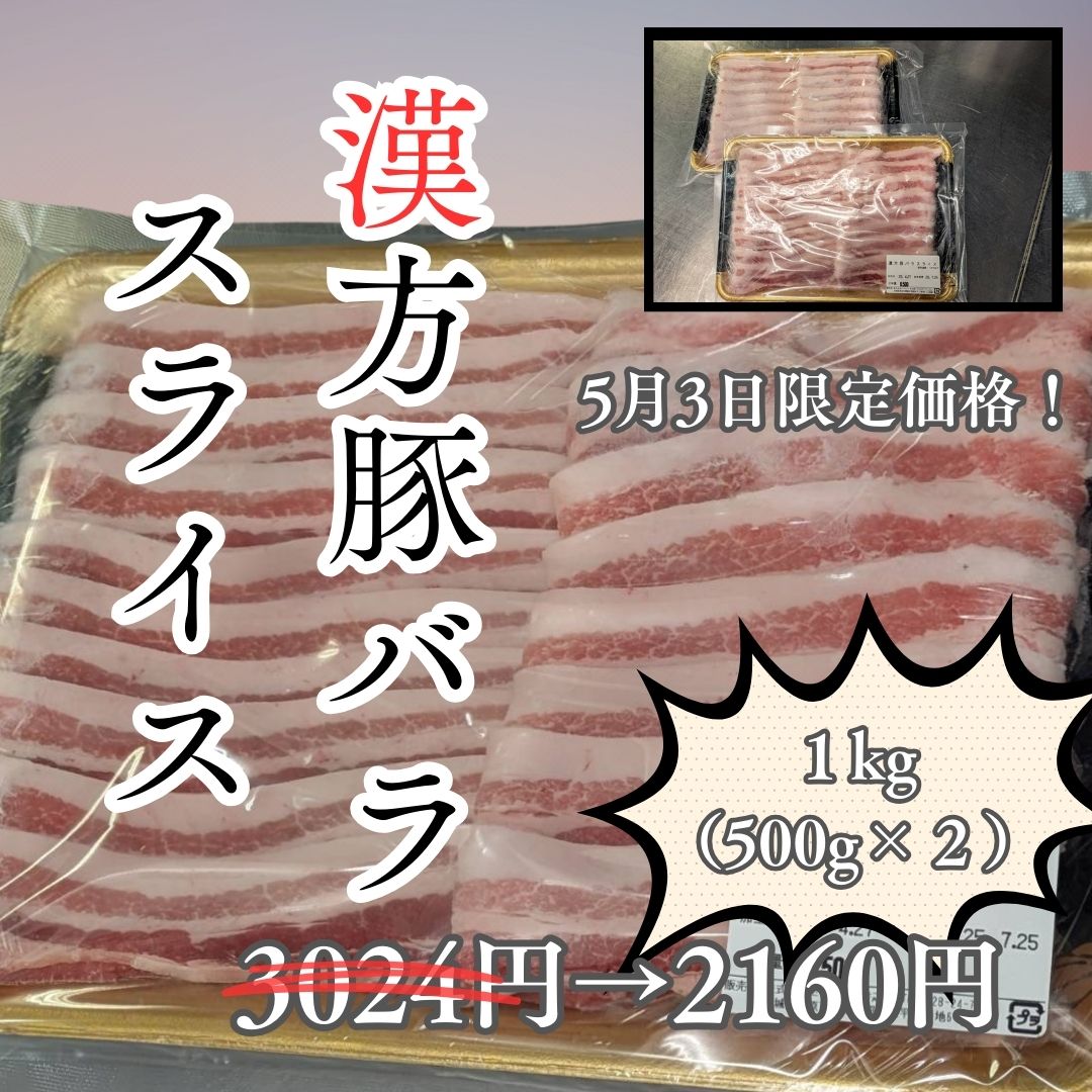 5月3日(土)限定!漢方豚 バラスライス1kg(500g×2)冷凍 2160円!早い者勝ち!