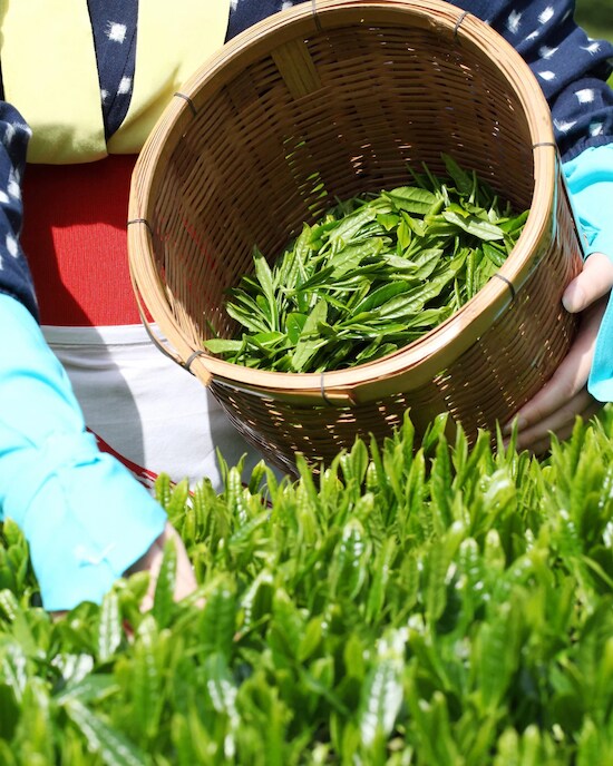 新茶を摘んでいる女性が、
