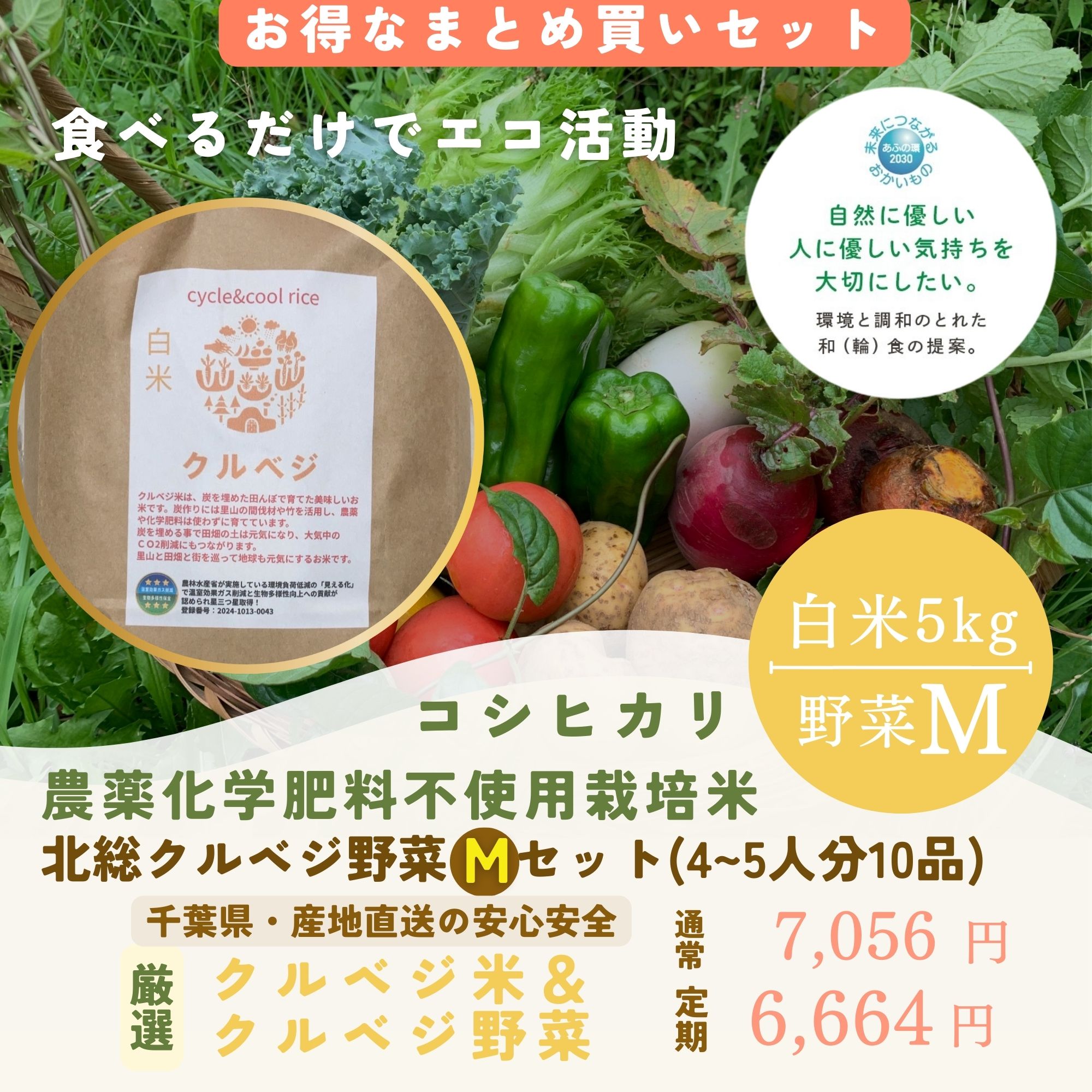 【白米5kg+野菜Mセット】農薬化学肥料不使用栽培米「クルベジ米」+クルベジ野菜Mセット