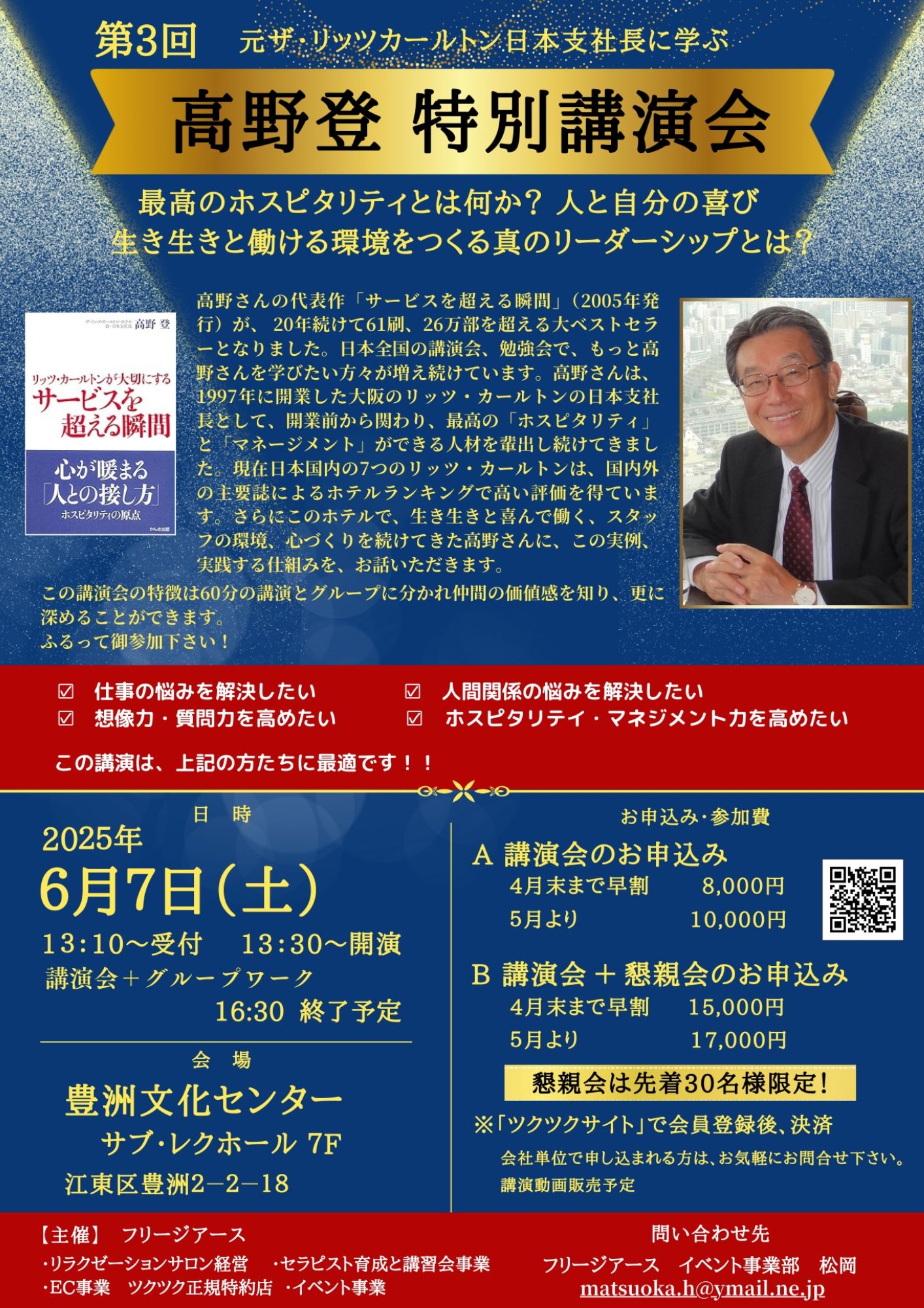 「最高のホスピタリティとは何か?」、人と自分の選び「生き生きと働ける環境をつくる真のリーダージップとは?」をテーマに、高野さんの「やさしい笑顔」と「きめ細かな言」で講演いただきます。