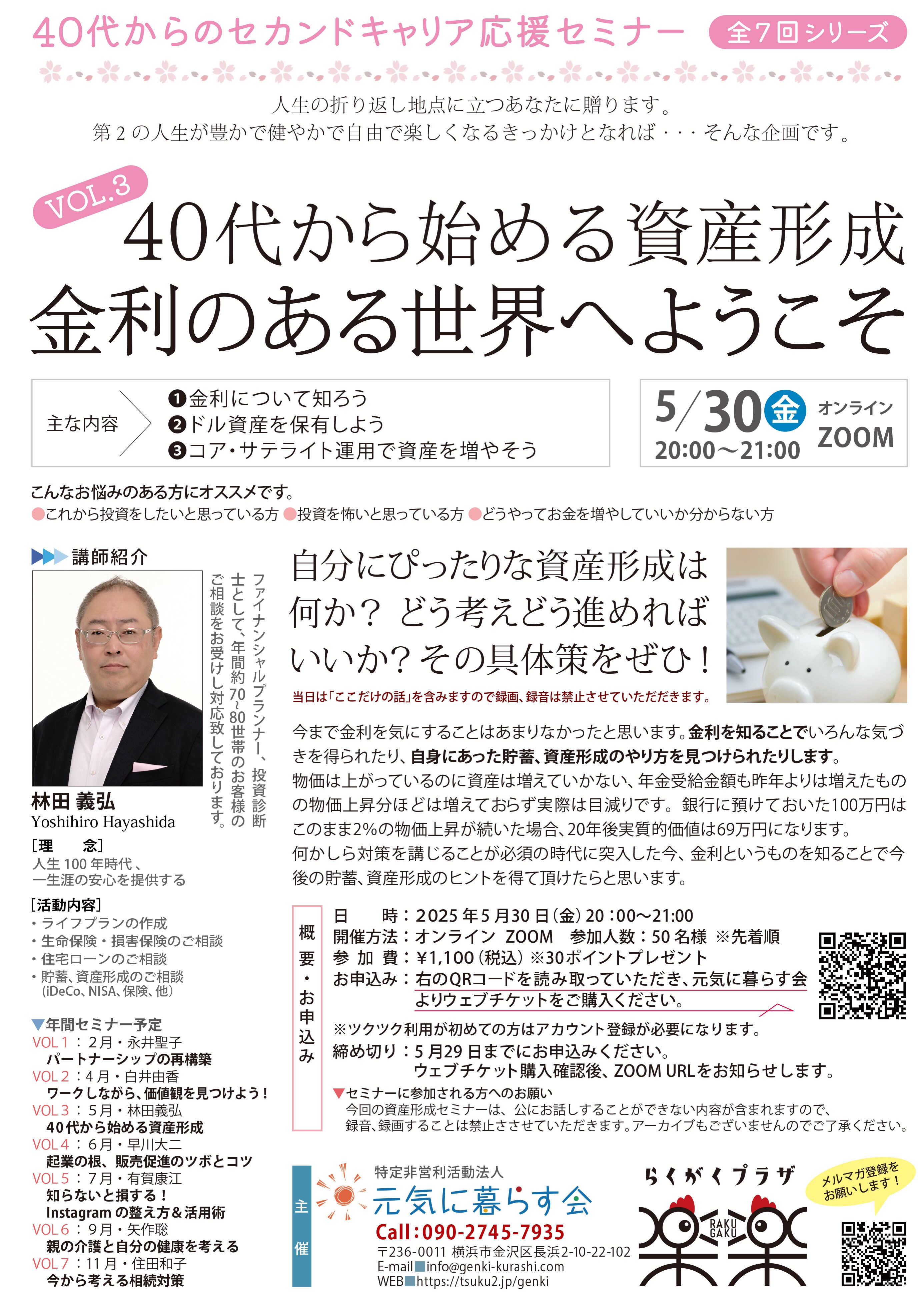 「40代からのセカンドキャリア応援セミナー」と題して、本年全7回シリーズのセミナーを企画しました。人生の折り返し地点に立つ方々を対象に、第2の人生に横たわる様々な不安や悩みを少しでも軽減し、豊かで健やかで自由で楽しくなるきっかけとなれば・・・そんな想いで展開しています。