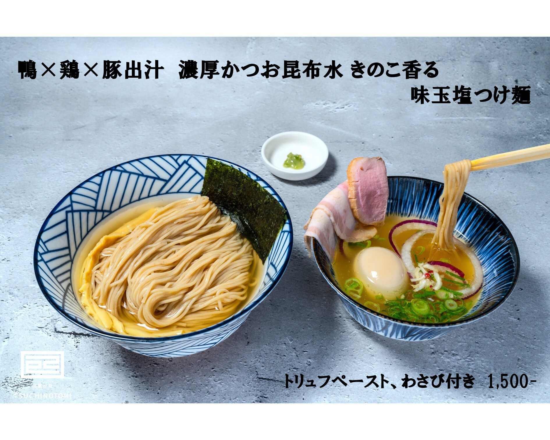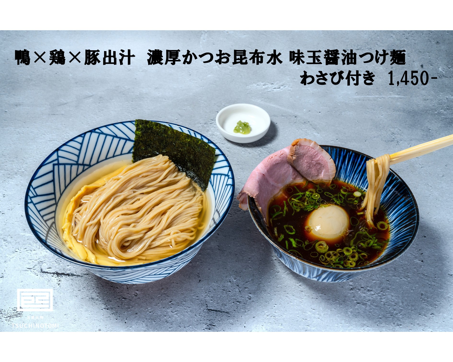 当店の「鴨×鶏×豚出汁 濃厚かつお昆布水つけ麺」は、冷たい麺と熱々のつけ汁が絶妙な一品です。