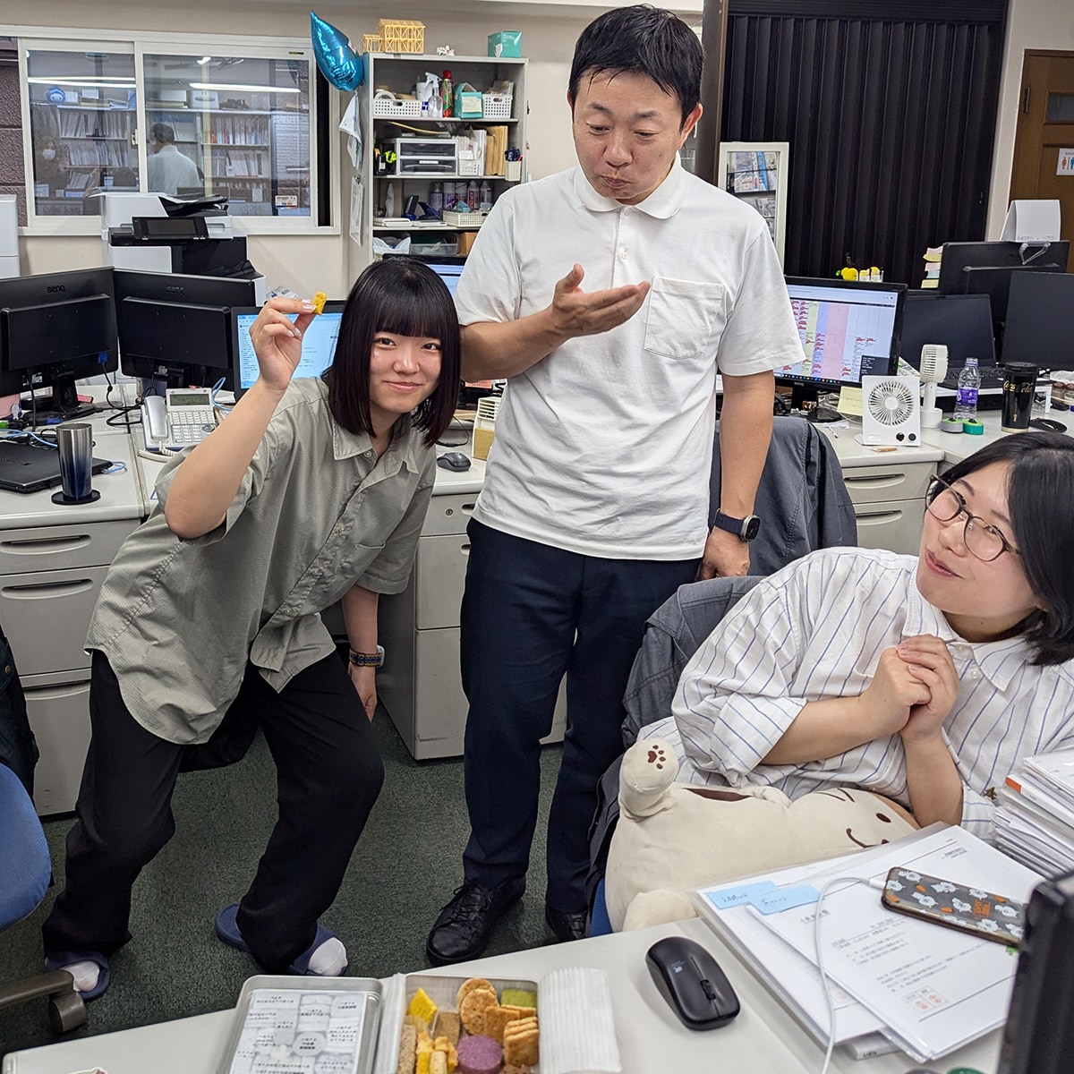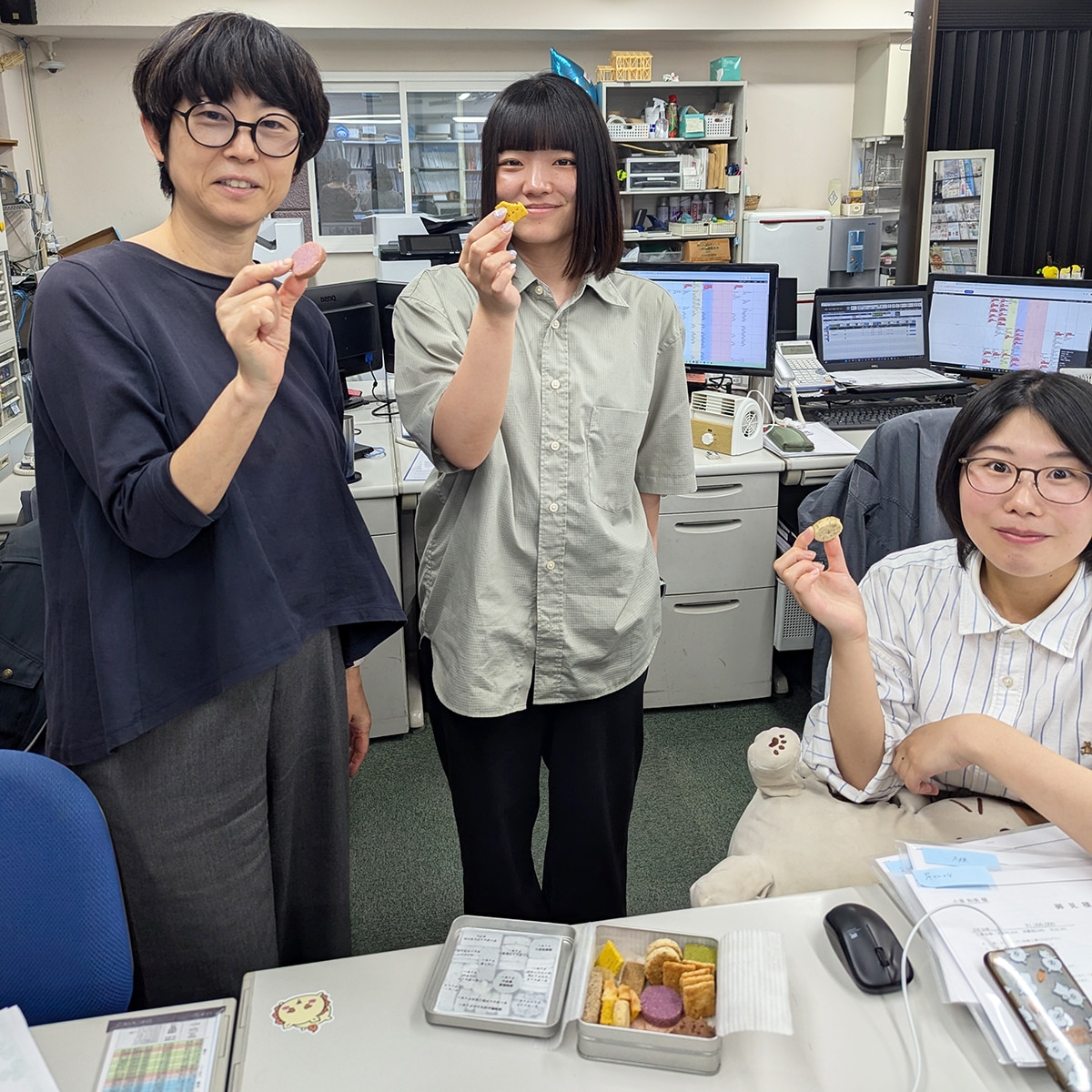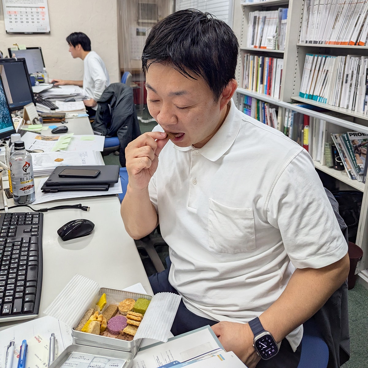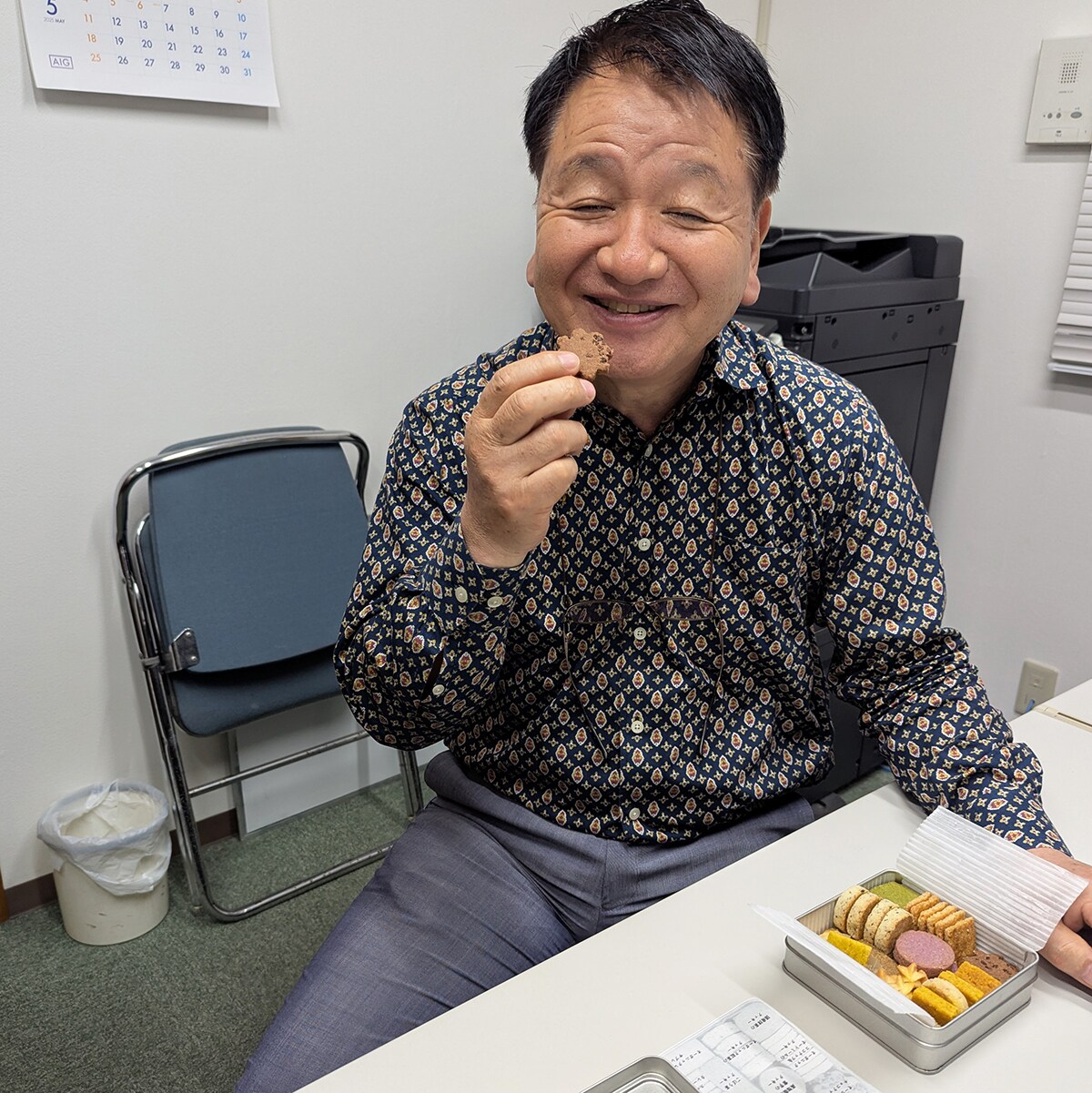 営業スタッフのフロアにやってきました。「ちょっと頭を休めて、米粉クッキーはいかが?」
