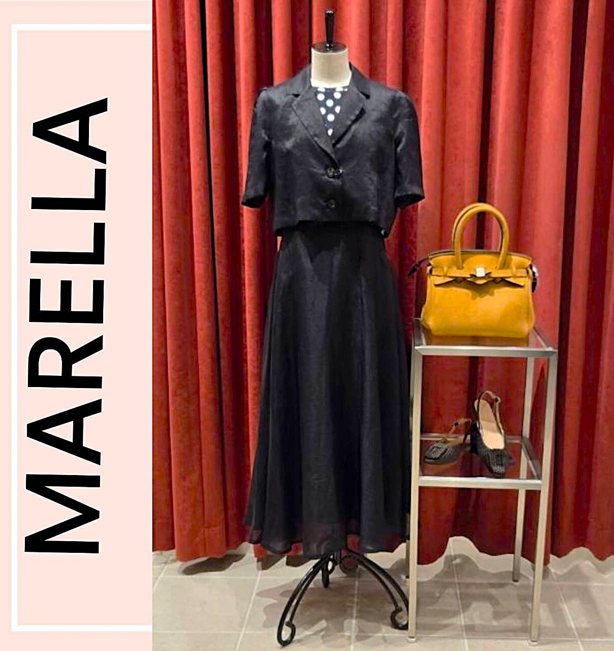 Blackリネン素材の、テーラードジャケット&フレアスカートのセットアップ(MARELLA マレーラ)