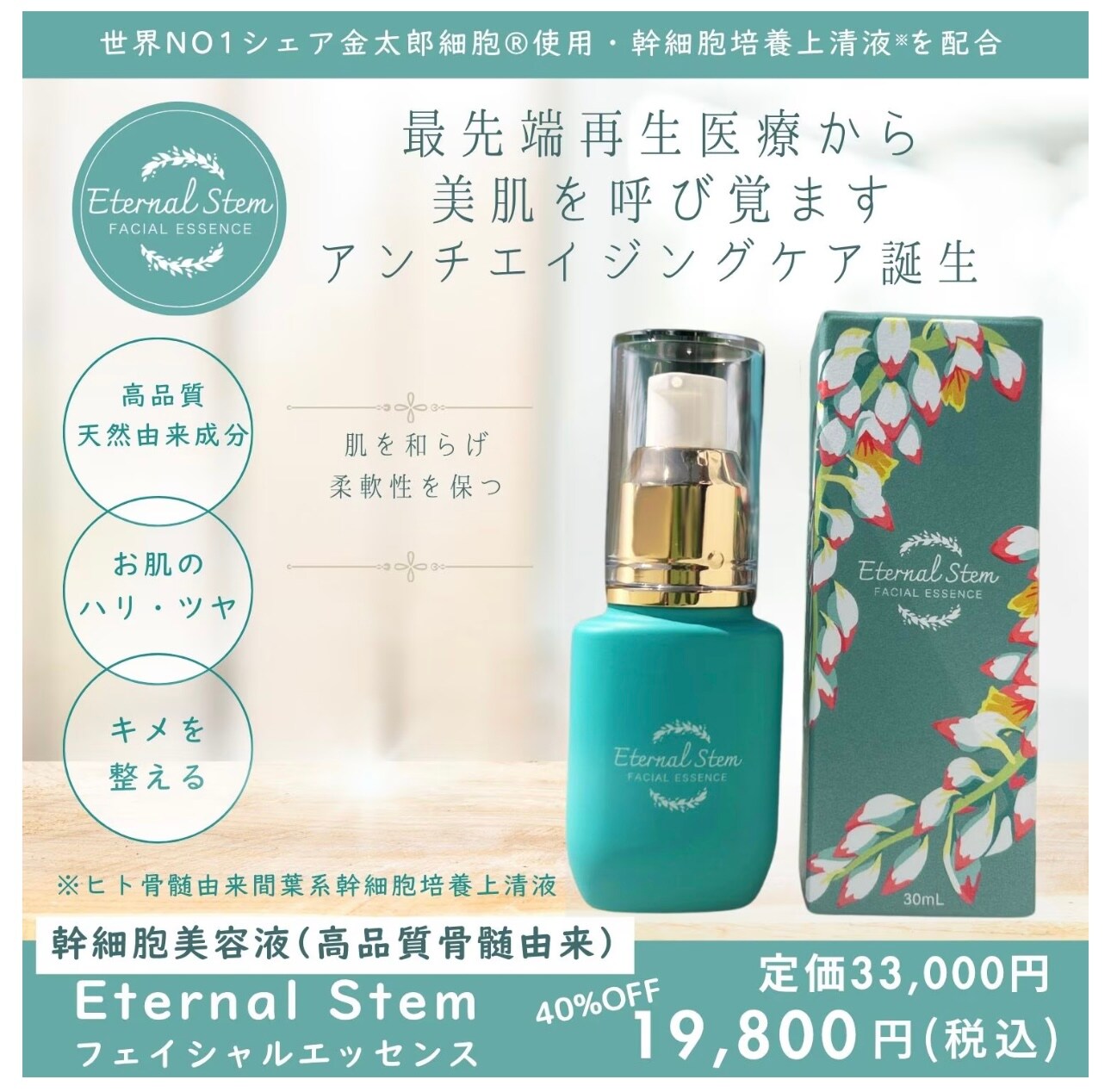世界NO.1シェア金太郎細胞®(高品質骨髓由来)使用、幹細胞培養上清液配合の幹細胞美容液。