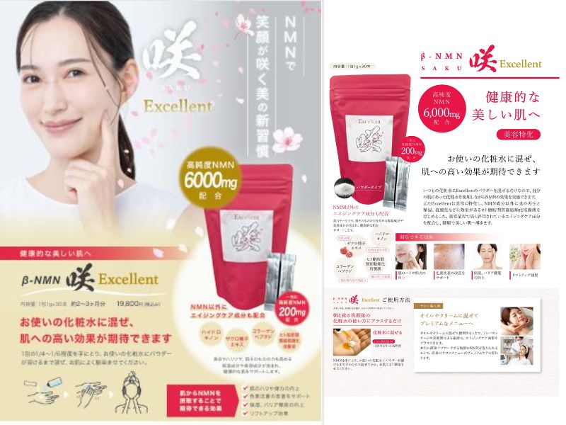 帰宅後、すぐに「咲 -Saku- Excellent」について調べた。高純度NMNを6,000mgも配合し、さらにハイドロキノン、ザクロ種子エキス、コラーゲンペプチドといったエイジングケア成分が贅沢にブレンドされているという