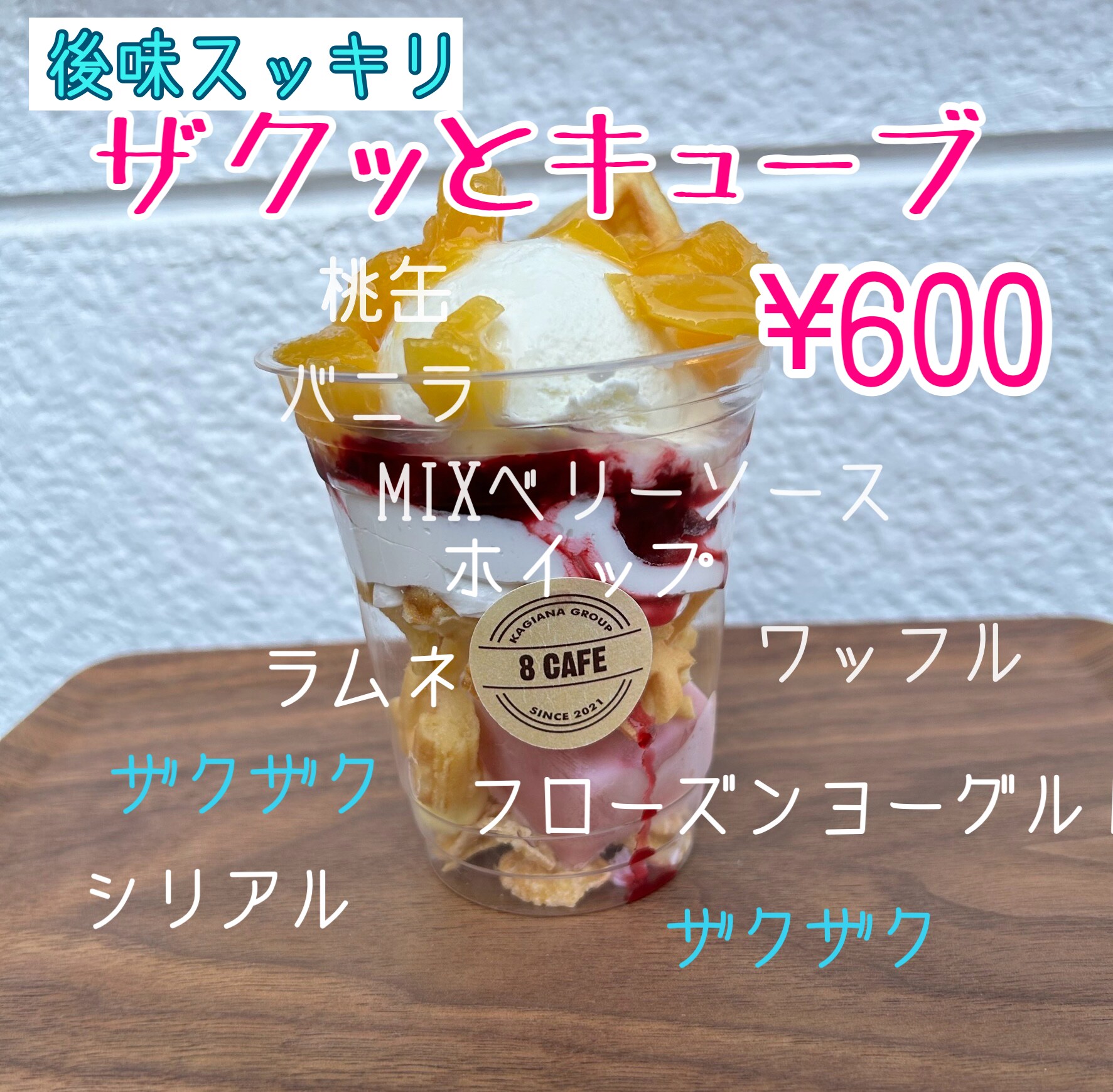バニラアイスと桃缶の優しい味を進めると、甘酸っぱいMIXベリーソースがホイップにマッチング💓