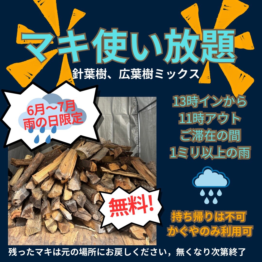 2025年6月、7月限定 雨の日ご利用のお客様、薪使い放題サービス!!(注意事項あり)いたします。 11時チェックインから11時アウトの間、数時間でも1ミリ以上の雨が降った、降る予報がある場合。
