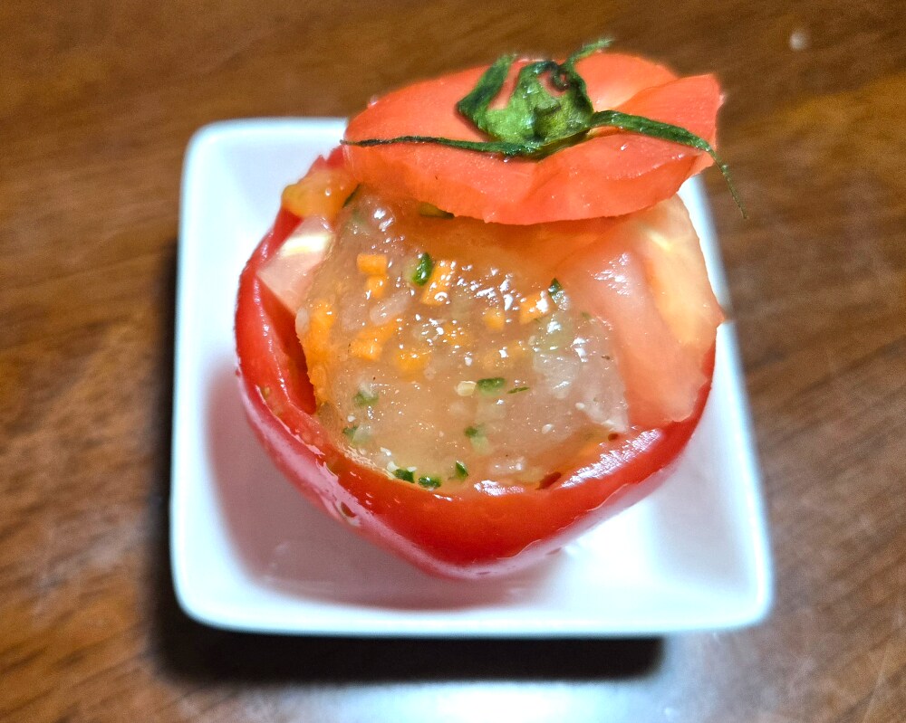 今回ご紹介するのは、トマトの器の酢の物です。甘酢を寒天で固めて砕きます。