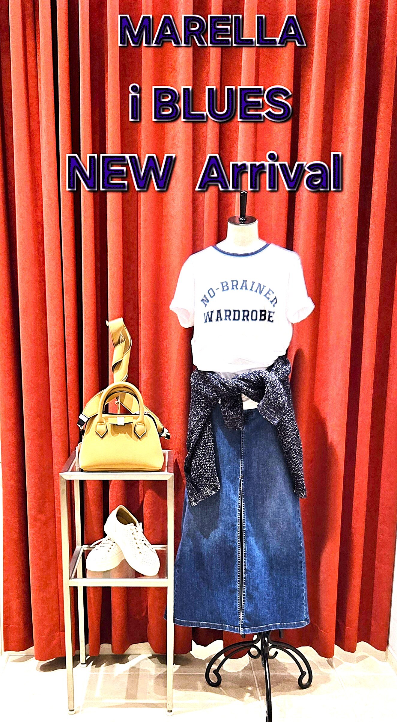 デニムのスカートの丈がやや長めなので、ウエストに巻いたカーディガンでメリハリをつけて腰高に⤴️