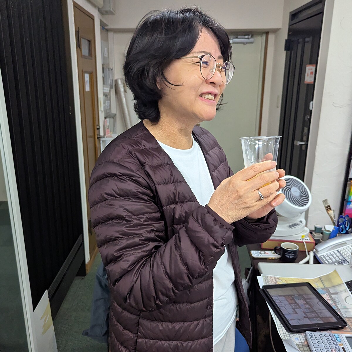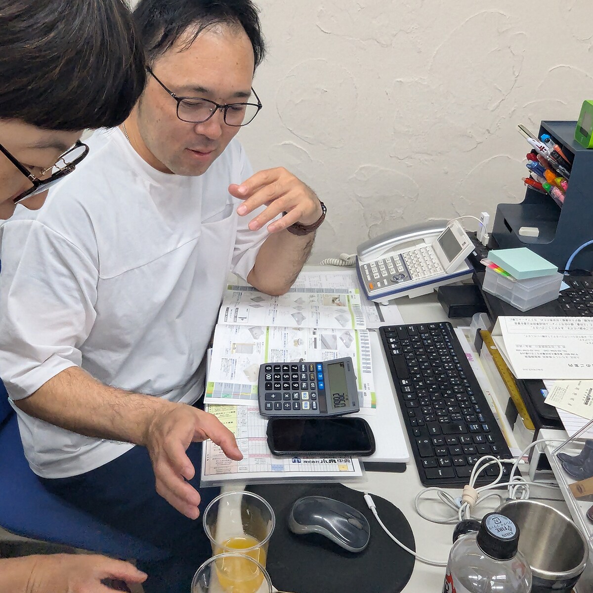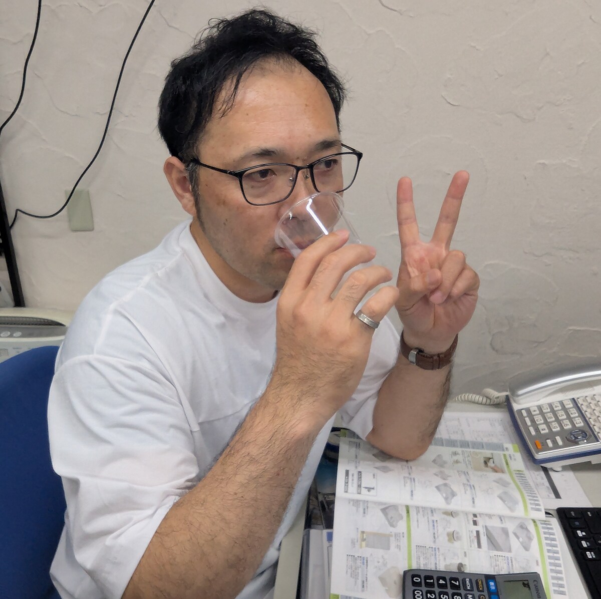 見積もり作成中の内装担当の久保は、まずはシークヮーサーを。