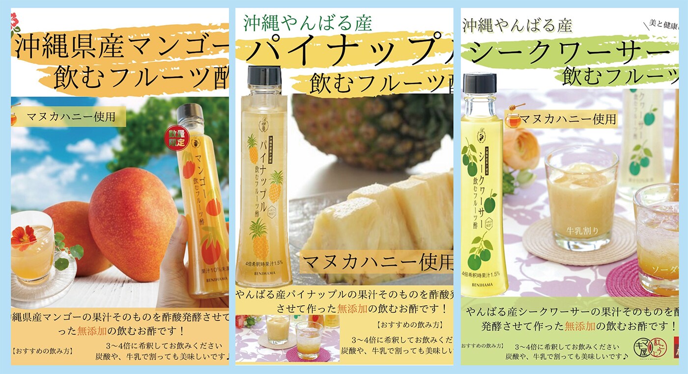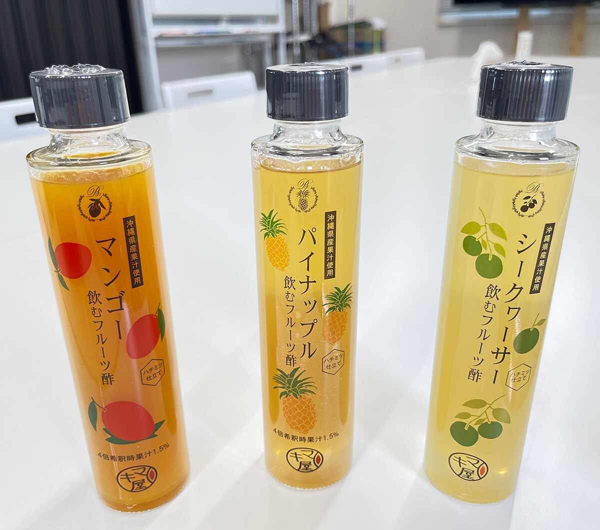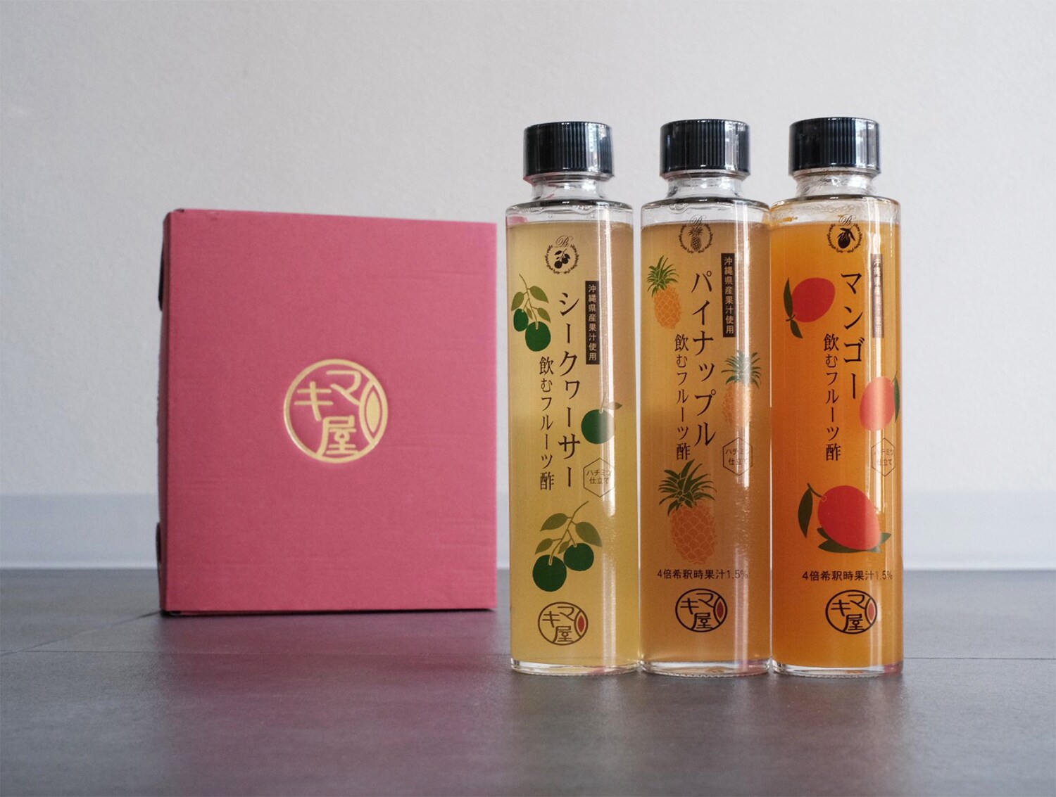 沖縄県・株式会社マキ屋フーズさんが手がける「飲むフルーツ酢3本セット(シークワーサー・パイナップル・マンゴー)」。
