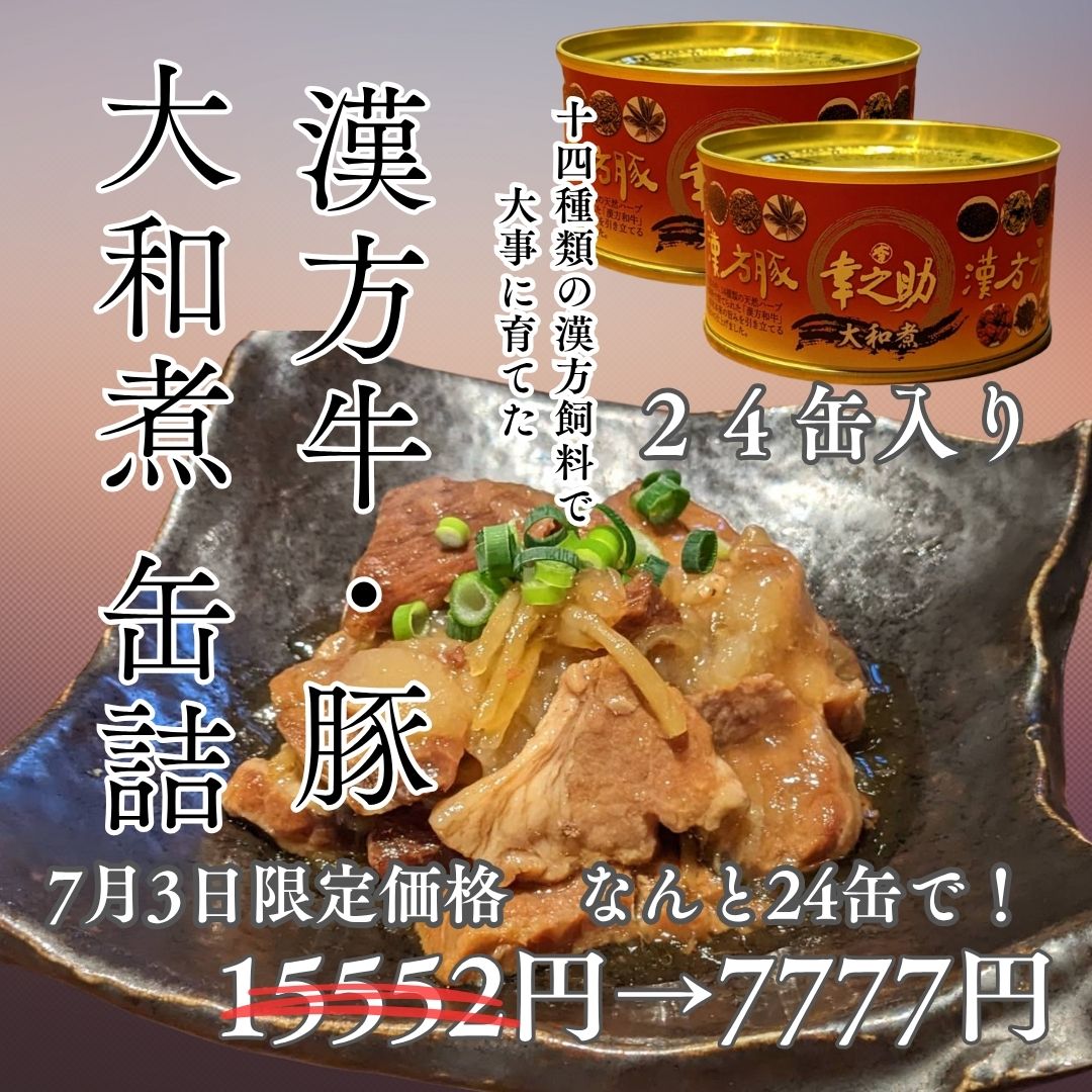 幸之助の日7月3日限定 漢方牛・漢方豚 大和煮缶詰 一箱(24缶入り)1日限りの大特価!!