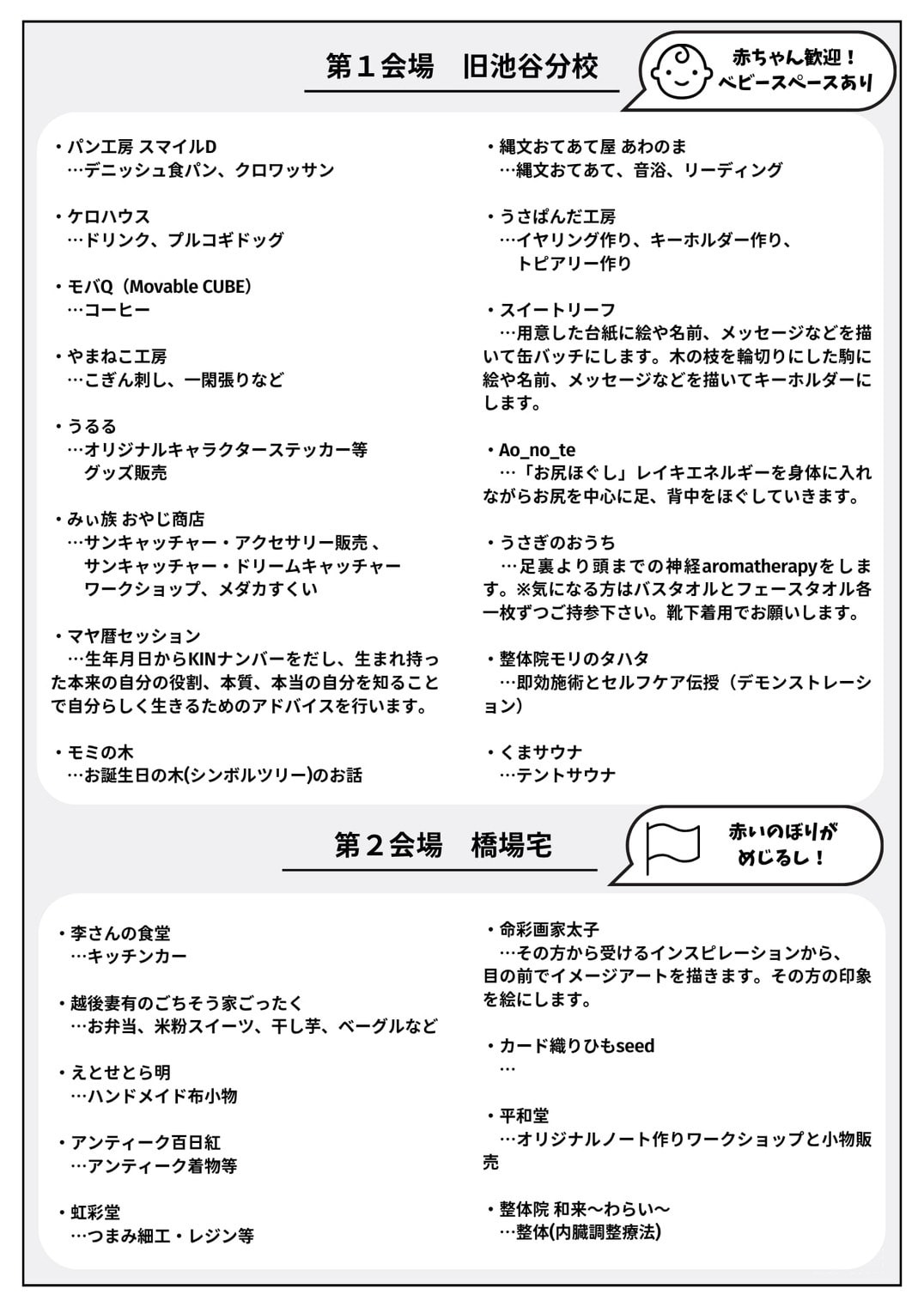 キッチンカー、雑貨販売、ワークショップ、施術など24店舗が出店します。