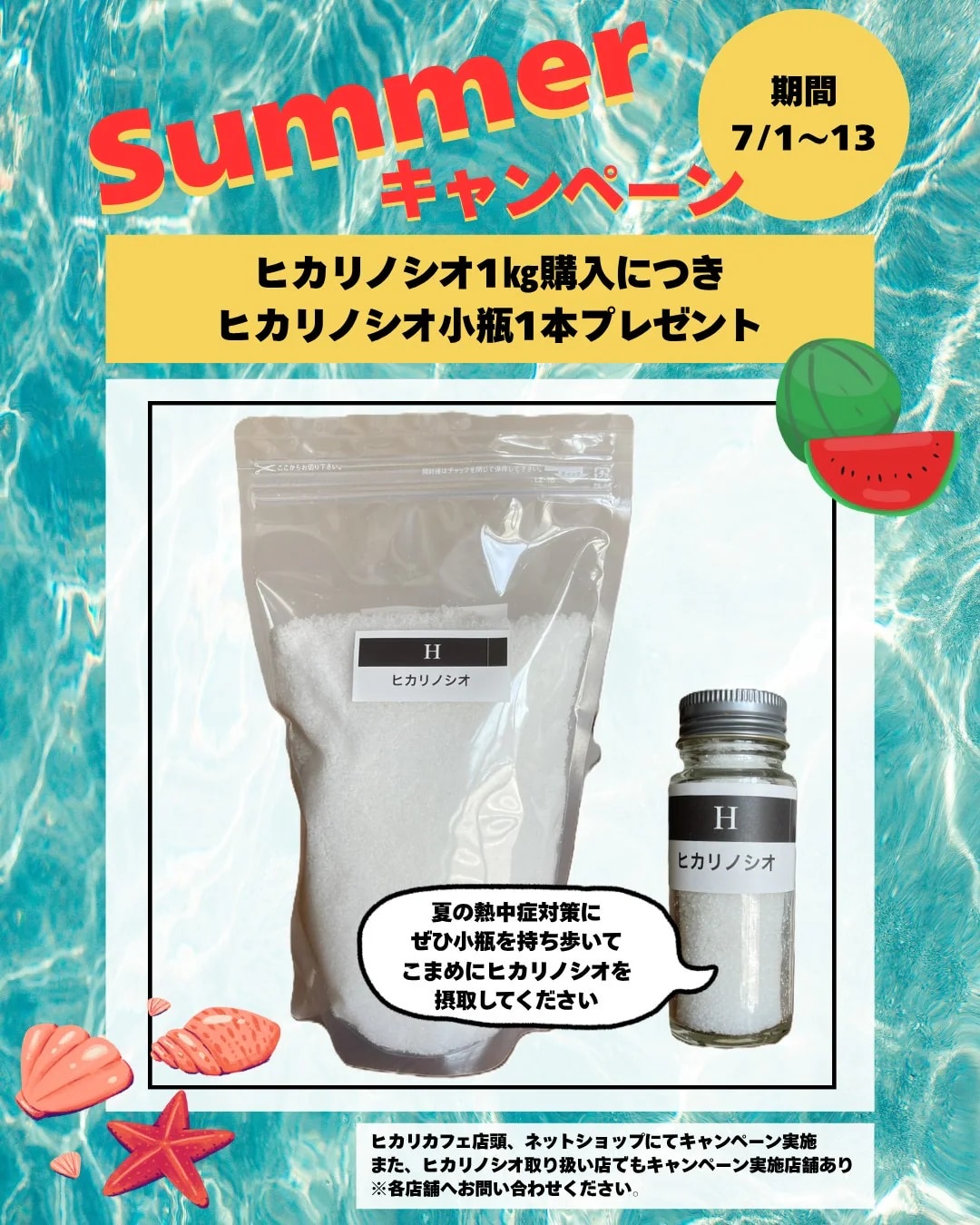 内容:ヒカリノシオ1kgご購入毎に、通常550円で販売されているヒカリノシオ小瓶(60g入)1本プレゼント!