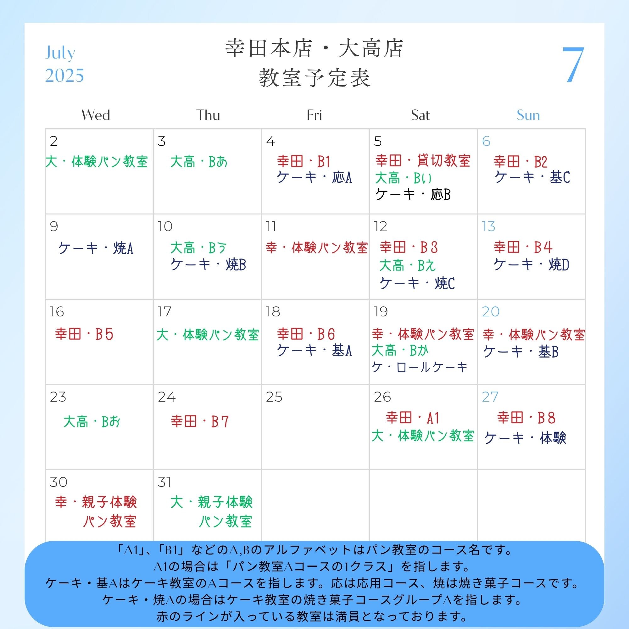 7月のパン・ケーキ教室の開催予定はこちらになります。